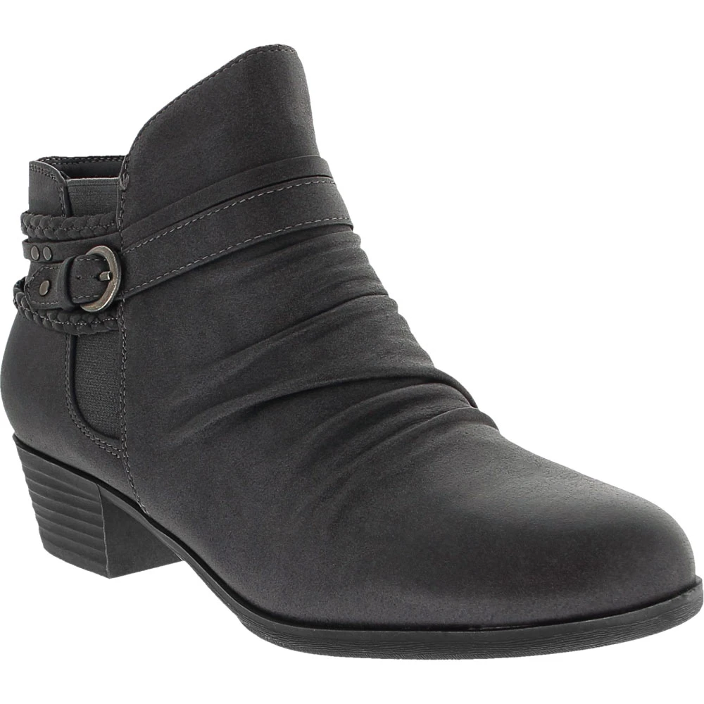Wear.Ever. by BareTraps Nobalee Ankle Boots – Womens. BareTraps Nobalee Ankle Boots are womens ankle boots that are comfortable and stylish. With synthetic uppers, stacked heels, ruched fronts, braided accents, novelty buckles and strappy back details, these boots can be worn all day long with denim, leggings, or any other skinnies. They also feature goring details and inside zip closures. These statement boots dress up your casual wear.