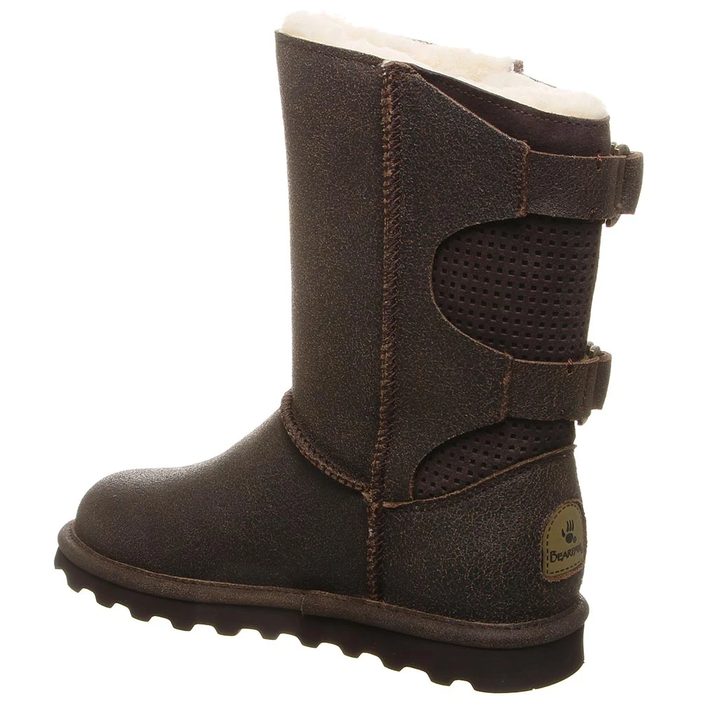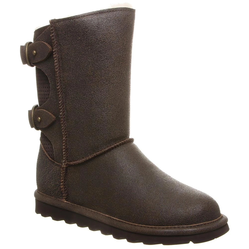 Bearpaw Clara Comfort Winter Boots – Womens. The Bearpaw Clara is versatile, stylish and comfy. The upper features an accenting back panel with geometric perforations and double D-ring straps. NeverWet technology treatment makes these womens winter boots waterproof to keep you dry in any weather and prevents stains. The sheepskin comfort footbed cushions your feet to provide long-lasting comfort, and the lightweight rubber outsole provides traction to keep each step steady. The slide-on design makes them easy to put on and remove.