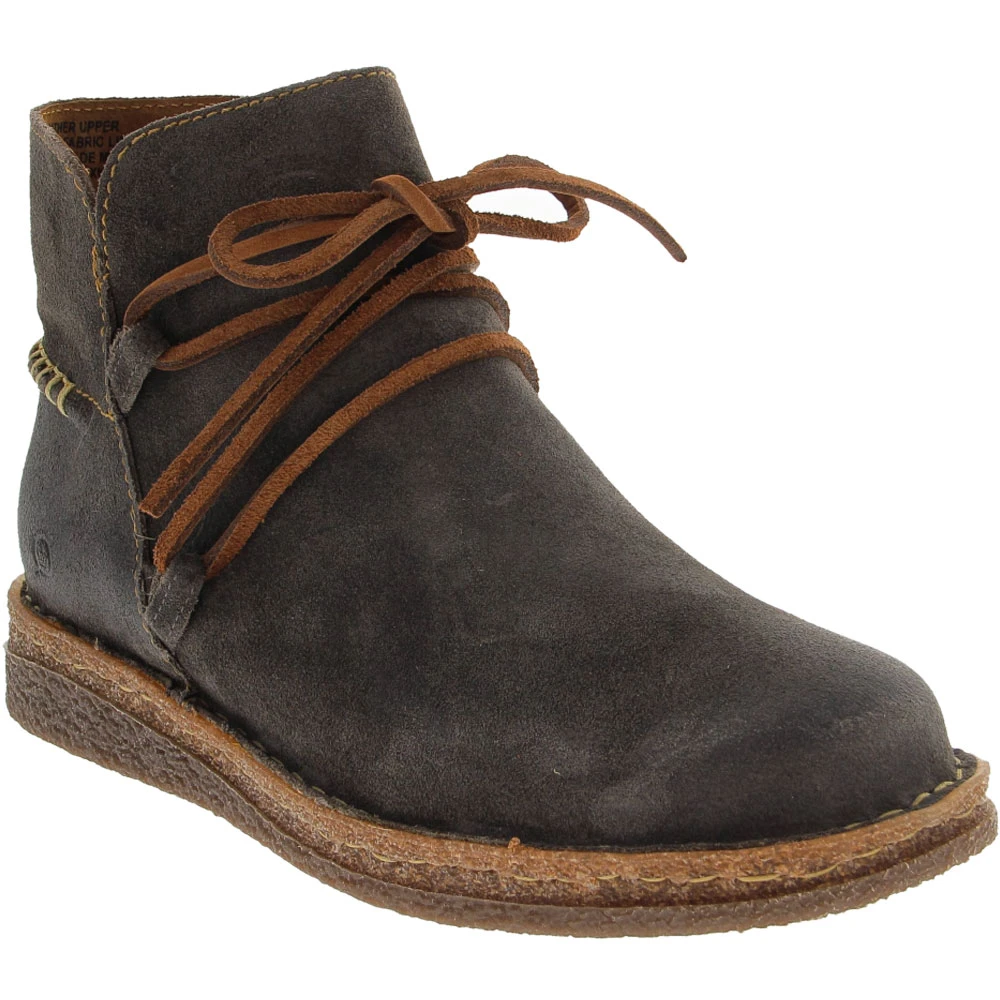 Born Calyn Womens Casual Boots. Experience comfort, style and convenient practicality when you put on these ankle-height womens casual boots. Designed with a cushioned, removable insole and a suede leather upper, the Born Calyn Casual Boots combine hand-sewn construction with all-day cozy comfort. The high-traction sole is durable and flexible. The textile and leather insole and lining add a pleasant feel, and the cork-infused midsole provides essential support.