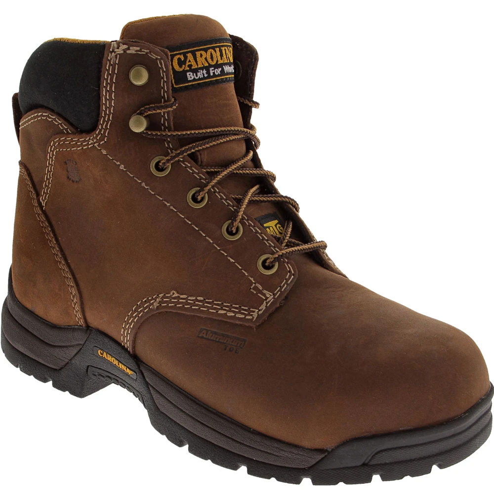 Carolina CA1428 Women’s 5 Inch Internal Met Guard Work Boot. This full grain brown leather upper boot has an aluminum safety toe cap, a polyurethane Internal Met Guard and is also Electrical Hazard rated. There is mesh lining, a removable EVA footbed on top of Carolina’s ‘Pillow Cushion’ insole. The non-metallic shank makes this boot a little lighter and has a rubber outsole for comfort.