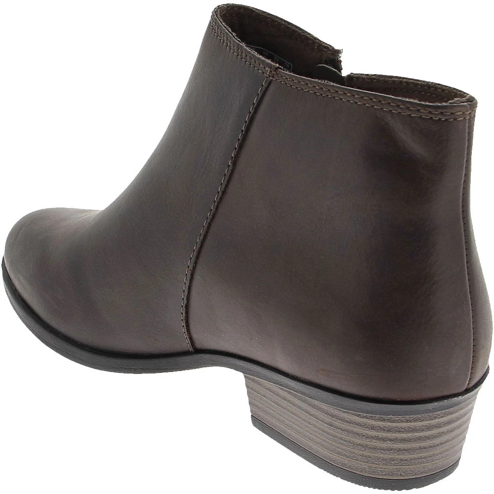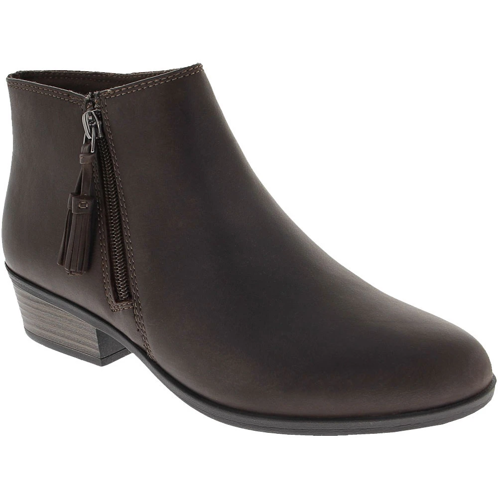 Clarks Addiy Teri Ankle Boots – Womens. Clarks Addiy Teri Ankle Boots – Womens are comfortable and fashionable ankle boots. These stacked heeled boots feature tassel trims and full-length zippers. Comfort comes from the brand’s Cushion Soft™ and an OrthoLite® footbed, including underfoot cushioning and a cushion pad at the heel. The outsole is made to provide grip and additional comfort for long walks. Keep it casual by pairing these boots with a skirt or denim.