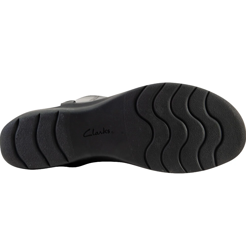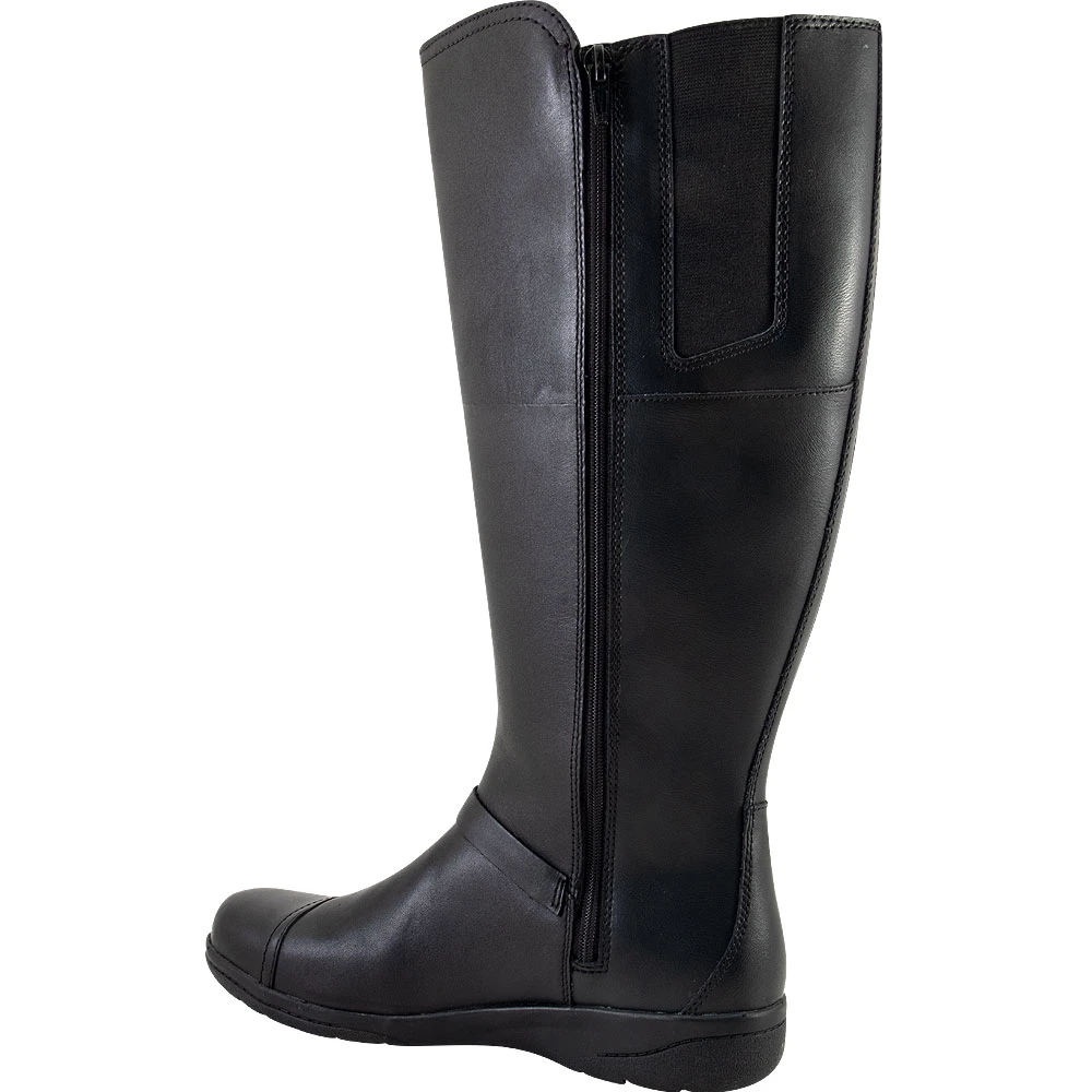 Clarks Cheyn Linde Wide Shaft Womens Tall Dress Boots. The best part of cold weather is showing off your new womens dress boots, especially when they exude class and sophistication. These simple yet elegant boots are versatile enough for dressing up or down. They have a sleek leather upper with a decorative cross strap and metal fittings. Designed for all-day comfort, with hidden gore side panels that keep moves flexible and a foam-cushioned footbed that minimizes shock impact.
