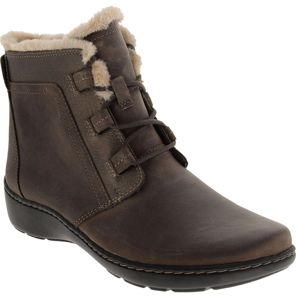Clarks Cora Chai Ankle Boots – Womens. Built in the style of classic hikers boots but bringing in cozy touches of women’s fashion, Clarks women’s Cora Chai Ankle Boots are prepared to take winter in stride. Real leather is lined with faux fur to keep toes nice and toasty and ensure snow, rain and puddles stay outside where they belong. These womens ankle boots come equipped with sturdy 1 1/2-inch heels to keep your feet out of any slush or snow and make sure you’re ready for your next rendezvous.