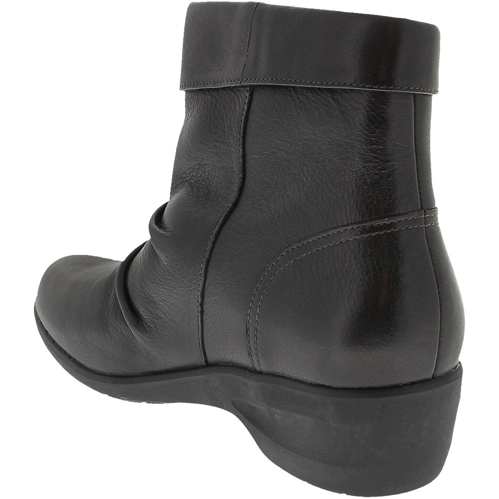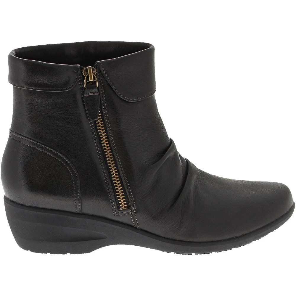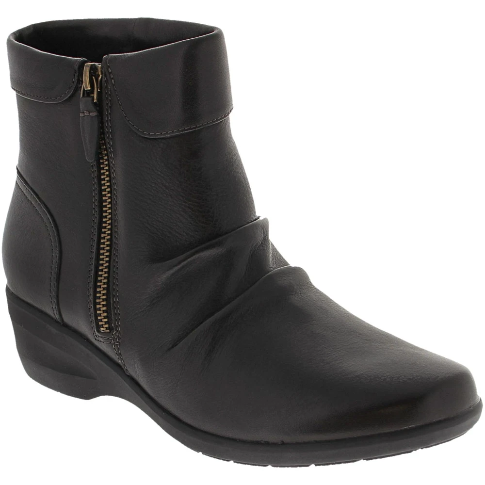 Clarks Rosely Zip Ankle Boots – Womens. When boot season arrives, show off your chic style wearing these womens ankle boots. The soft leather upper is adorned with ruched detailing and a folded collar that adds a modern twist to a classic look. A side zipper keeps them secure and easy to put on and take off. Designed for comfort, they have a moisture-wicking lined memory foam footbed that keeps feet dry and cushioned. The durable outsole is designed to handle wet or dry conditions.