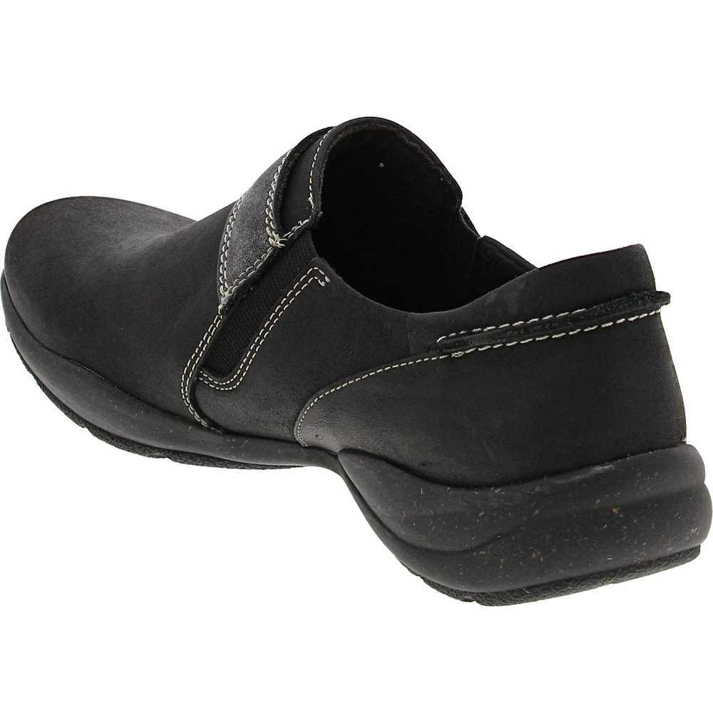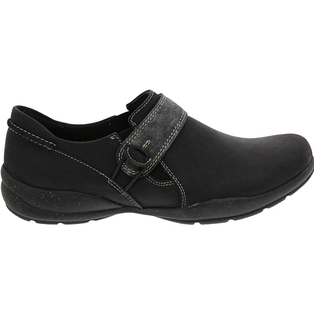 Clarks Roseville Dot Womens Slip on Casual Shoe. Exuding class and style is easy with this womens slip on casual shoe. Designed for busy modern women, it combines ease of wear with comfort and stability. The leather upper is adorned with a strap closure, providing a custom fit. The interior has a breathable textile lining and a foam footbed that cushions every step. Even if the terrain gets a little slippery or bumpy, you can count on the durable rubber outsole to deliver reliable traction.