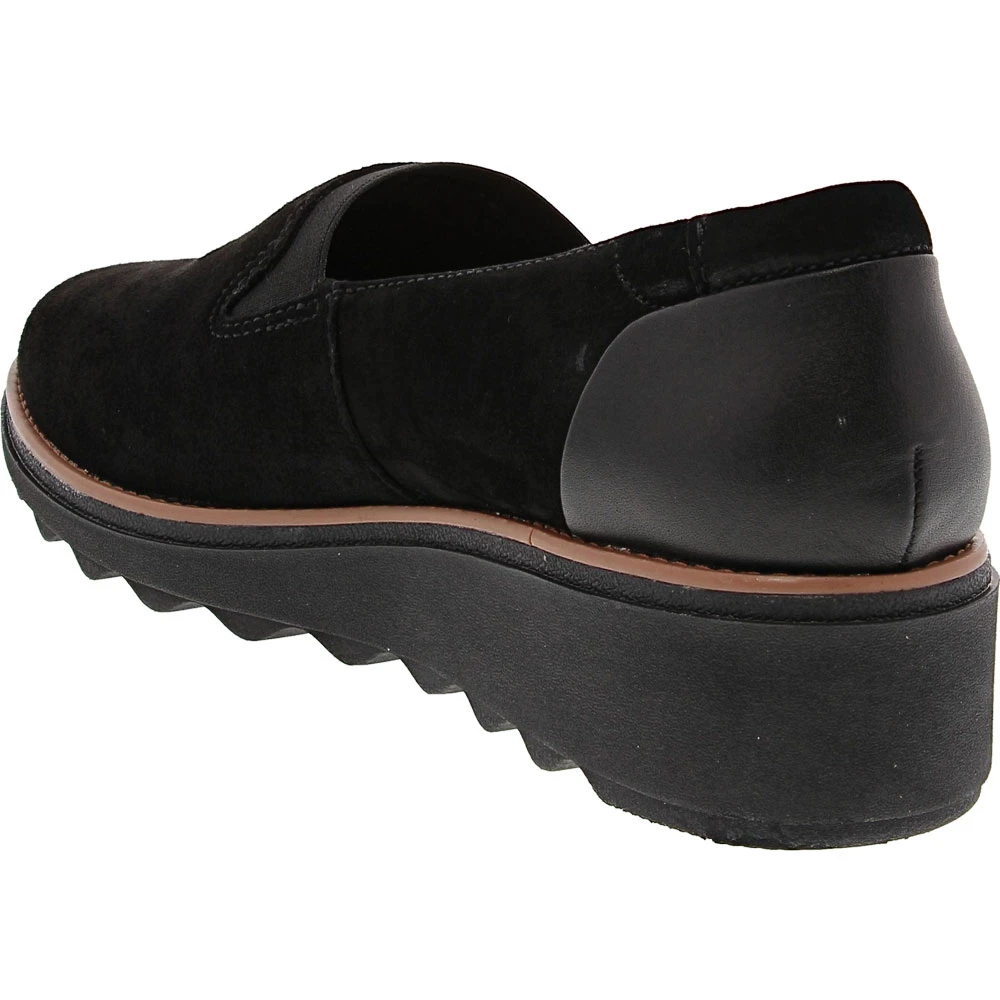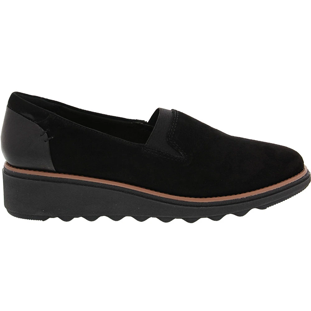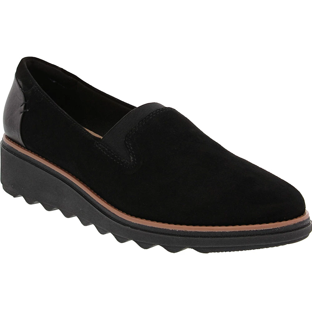 Clarks Sharon Dolly Slip on Casual Shoes – Womens. These modern loafers add class and sophistication to womens casual shoes. They have a sleek and stylish suede upper with subtle stitching details and patch accents on the heel. Elastic gore paneling makes them easy to wear and keep each step feeling flexible and natural. Designed to be supportive and cushioning, they have a memory foam footbed with a moisture-wicking lining. The wedge heel adds to their allure and supports the feet thanks to a lightweight EVA outsole.