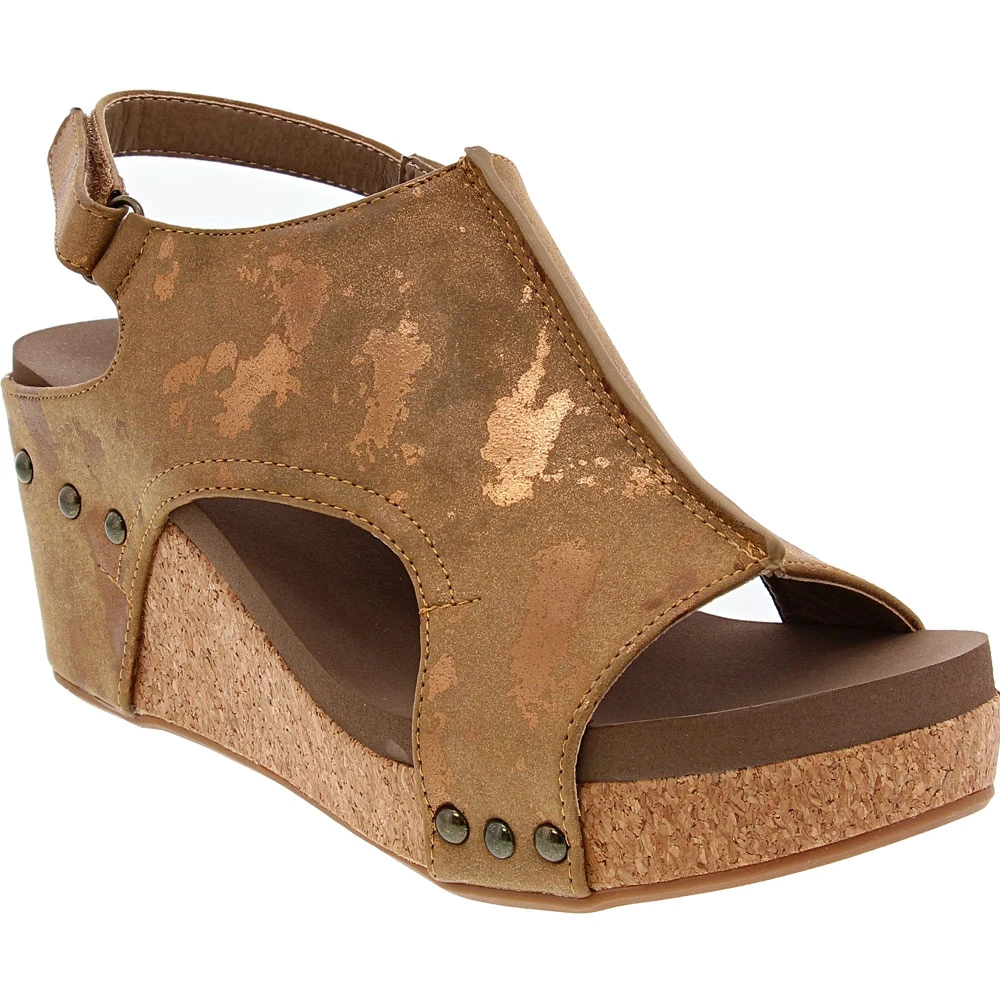 Corkys Carley Sandals – Womens. When you want the look of a bootie but need warm-weather-friendly footwear, these womens sandals pack a stylish punch. Modern, trendy and stylish, these wedges have a faux-leather upper with an open heel, peep toes, subtle side cutouts and metal accents. A hook-and-loop closure provides an adjustable fit while the cushioned insole makes staying on the go more comfortable. The cork midsole is flexible and lightweight while the rubber outsole provides needed traction.