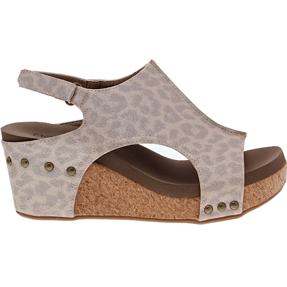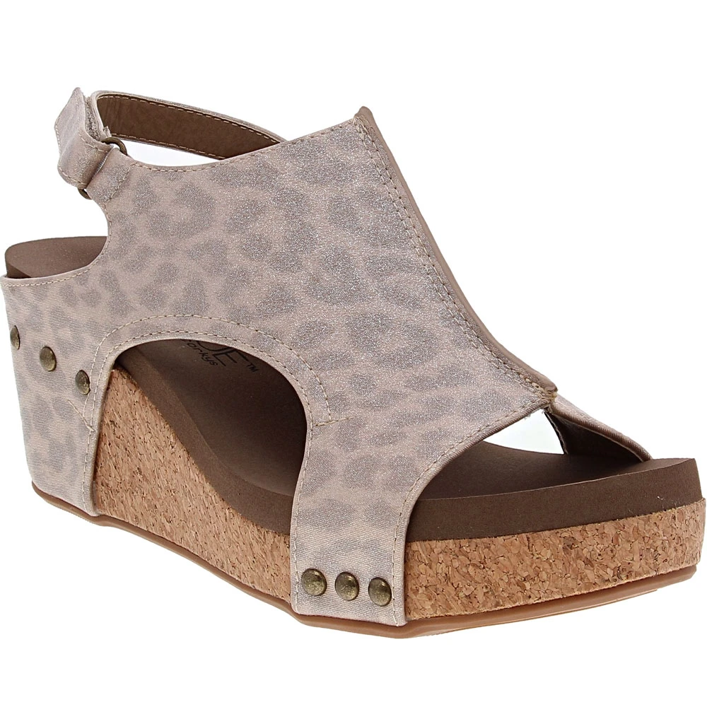 Corkys Carley Sandals – Womens. When you want the look of a bootie but need warm-weather-friendly footwear, these womens sandals pack a stylish punch. Modern, trendy and stylish, these wedges have a faux-leather upper with an open heel, peep toes, subtle side cutouts and metal accents. A hook-and-loop closure provides an adjustable fit while the cushioned insole makes staying on the go more comfortable. The cork midsole is flexible and lightweight while the rubber outsole provides needed traction.
