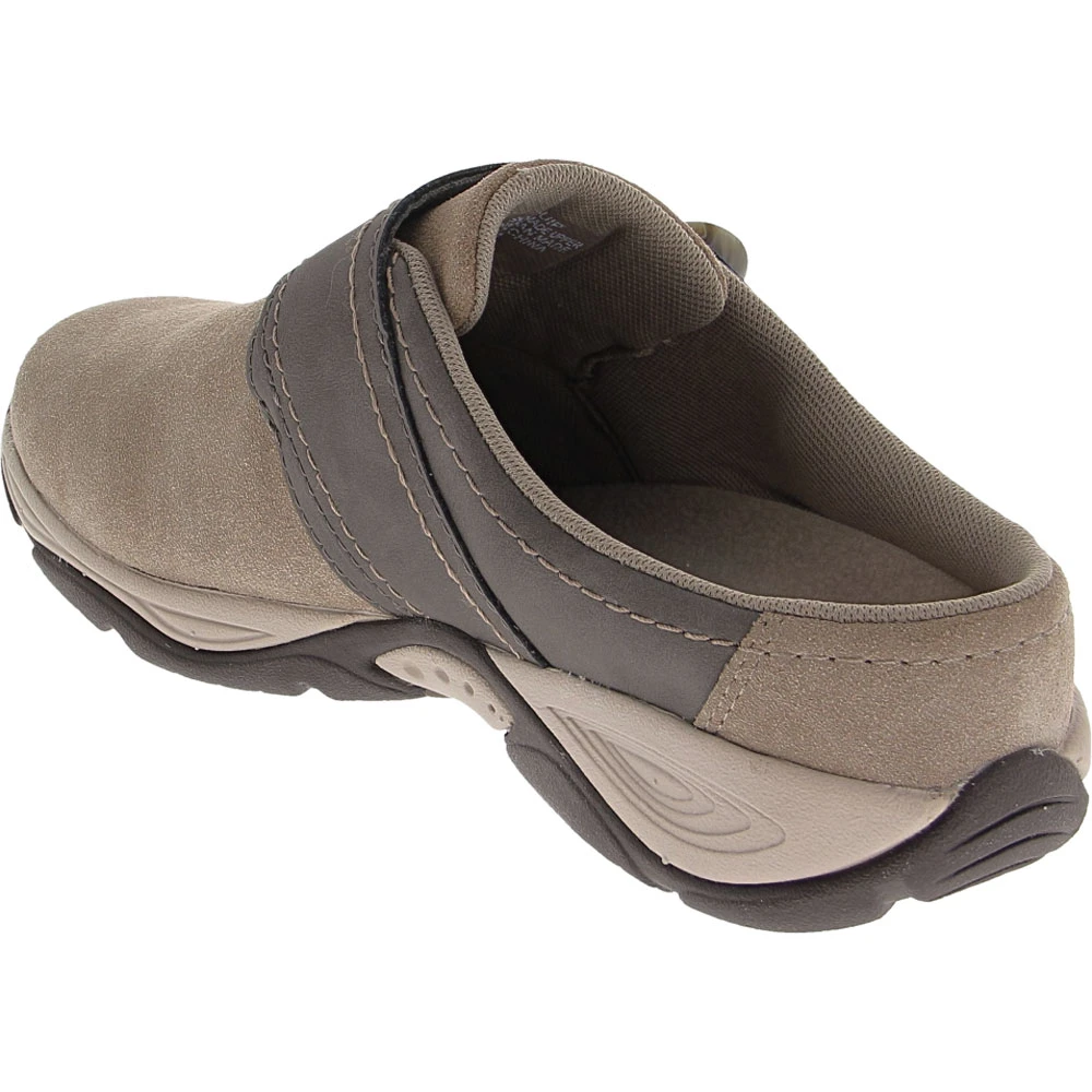 Easy Spirit Equip Clogs Slip on Casual Shoes – Womens. Your feet can experience all day comfort in these womens slip on casual shoes by Easy Spirit. This adorable clog-style slip on has a nearly-open back for easy on and off. The upper features a suede leather vamp. A wide, smooth leather strap in a contrasting color is embellished with topstitching and a large oval button and comfortably crosses the instep. The side quarter panel is also smooth leather. This shoe has a flat heel and a slip-resistant man-made outsole.