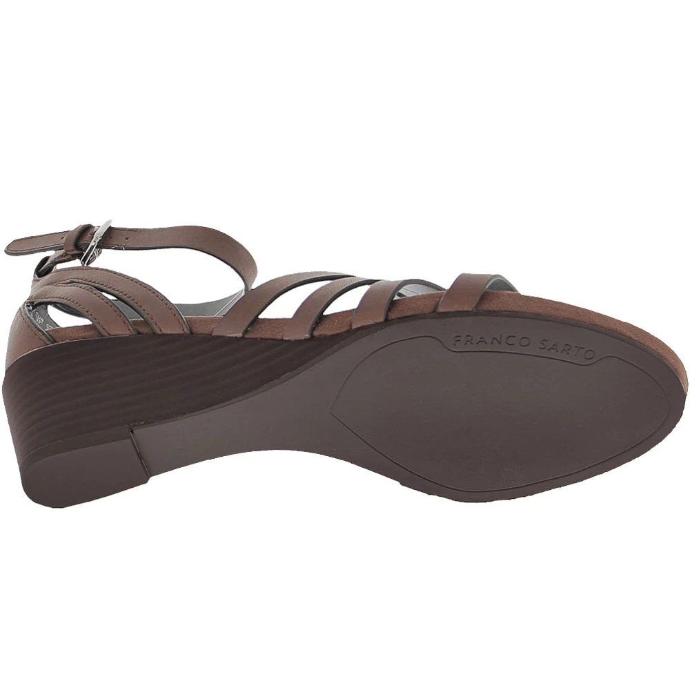 Franco Sarto Della Women’s Sandals. These chic, strappy wedge heels offer a classy look that can be dressed up or down, making them appropriate for almost any occasion and ideal for day-to-night wear. Four slim leather straps cover the vamp diagonally. Another strap circles the ankle, while an adjustable buckle closure allows a secure fit. The footbed is lightly padded for comfort, and the 2 ¼-inch stacked wedge heel is the perfect height for all-day wear.
