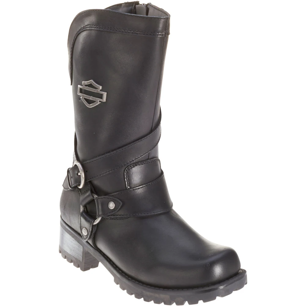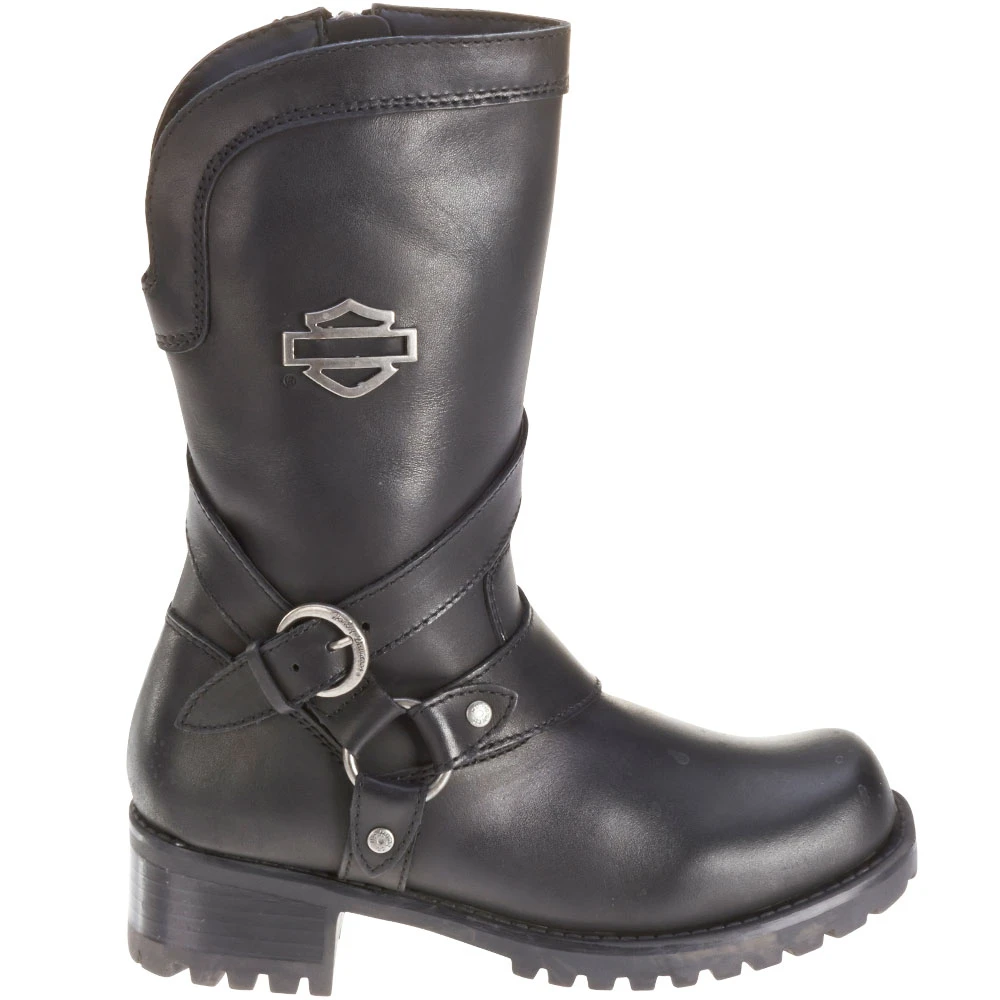 Harley Davidson Amber Women’s Casual Boots. Stylish and eye catching, this boot is sure to satisfy your inner rebel. Whether going for a ride, or heading out on the town, these boots will get you where you want to go and catch the attention of everyone there. The recognizable Harley Davidson silver logo stands out on the smooth black surface.