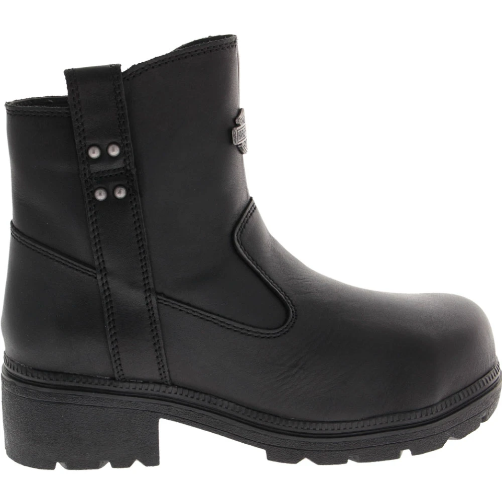 Harley Davidson Camfield Safety Toe Work Boots – Womens. Add some rocker attitude to your work attire in these womens safety toe work boots. Sassy, tough and dependable, these 5-inch boots offer the safety features needed and complement your style. They stay secure thanks to an inside zipper that locks. A soft leather upper adds a stylish flair while keeping feet protected and dry. The durable outsole keeps feet stable and supported and is resistant to oil, reducing slipping.