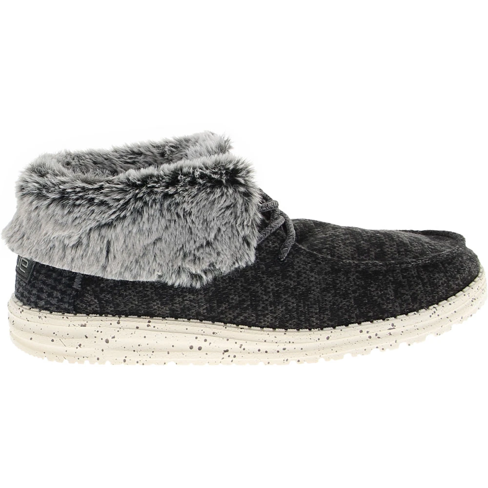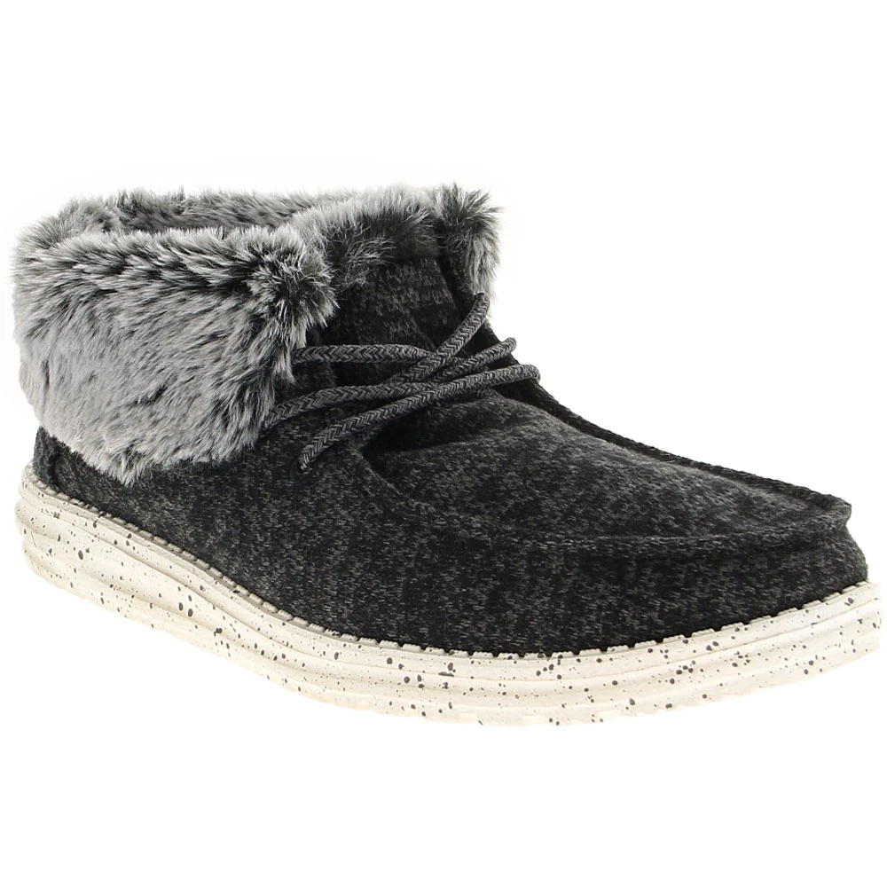 Hey Dude Britt Womens Casual Shoes. As the temperatures dip, you don’t have to give up your lightweight summer style when wearing these womens slip on lifestyle shoes. They have the classic silhouette you love with the added bonus of a faux-fur ankle cuff and lining to keep feet warm. Easy to put on and take off, these bootie-style shoes have a durable cotton canvas upper with lace-up securement. The interior features a memory foam insole for maximum comfort.