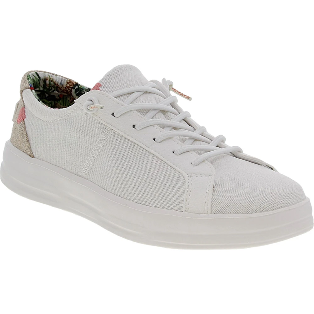 Hey Dude Karina Womens Slip On Casual Shoes. These womens slip on lifestyle shoes give the classic sneaker silhouette a new spin. The cotton canvas upper has a rounded toe and faux elastic laces that make heading out for errands or adventure a breeze. Designed to be flexible and lightweight, they have a removable cushioned insole and leather lining that lets feet breathe. These machine-washable sneakers have subtle details that add to their charm, making them a great everyday go-to shoe.