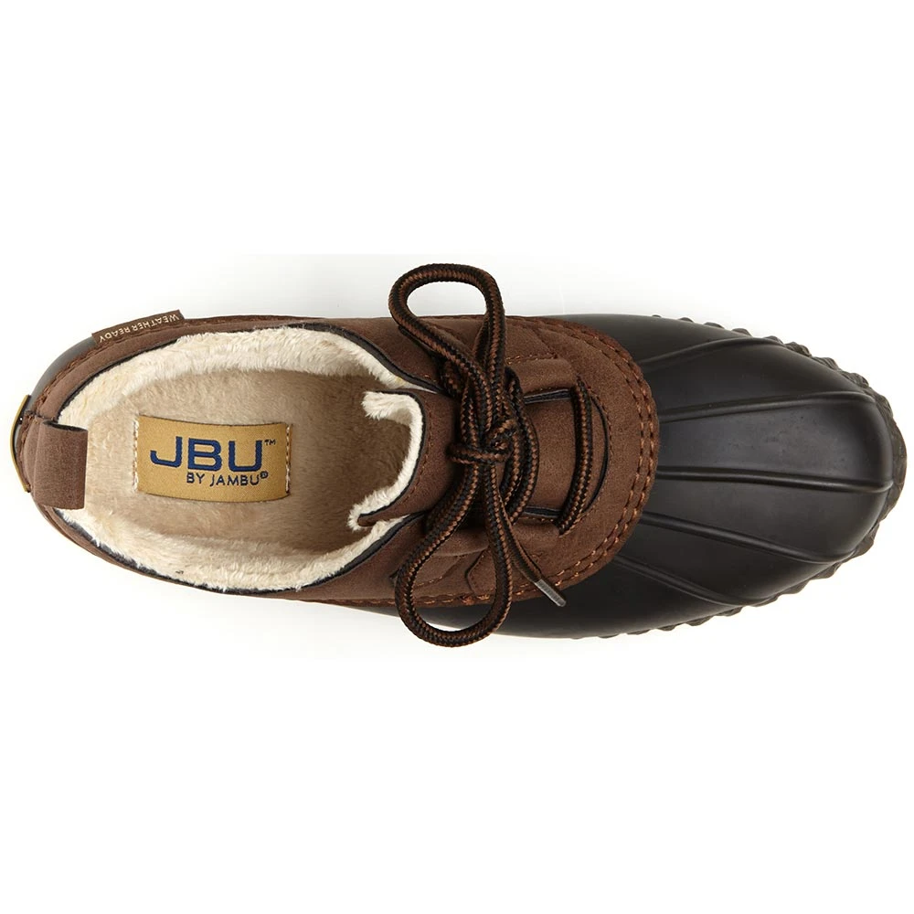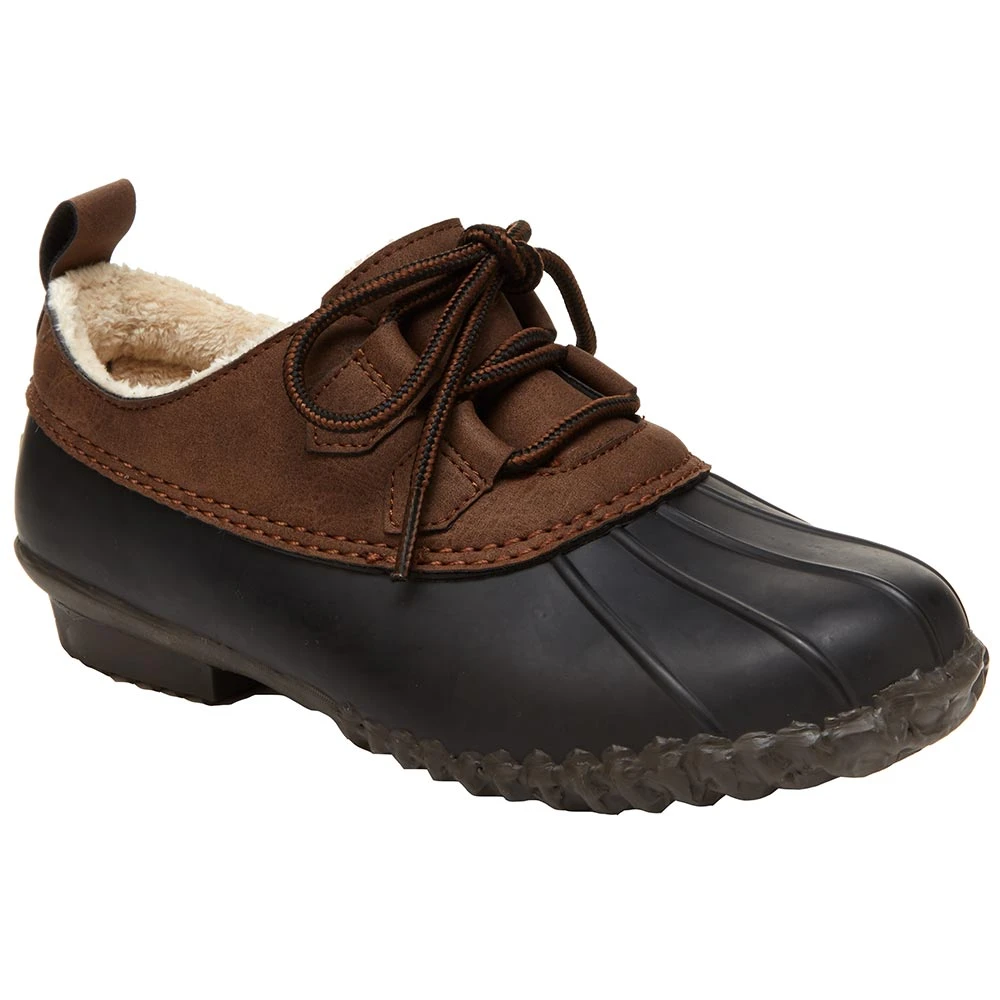 JBU Glenda Rubber Boots – Womens. Loafer style meets duck boot versatility in these womens winter boots. The waterproof upper is constructed of rubber and vegan leather, making it stylish and durable. A contoured EVA insole and fleece lining keep your feet warm and cushioned. The heel pull-tab provides easy on and off while the lace closure gives you a snug and adjustable fit. The rubber outsole gives you added traction on wet surfaces, making these boots a great choice for rain or snow.