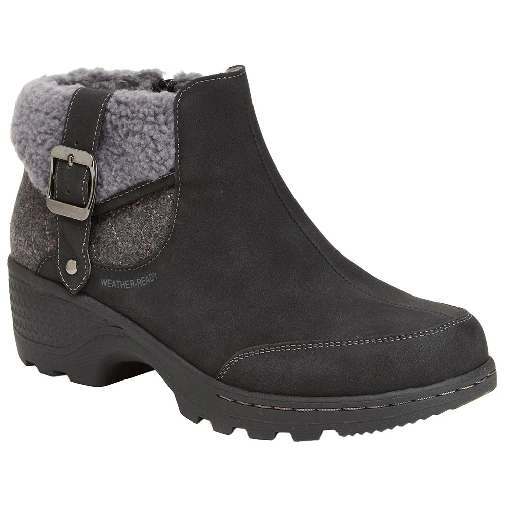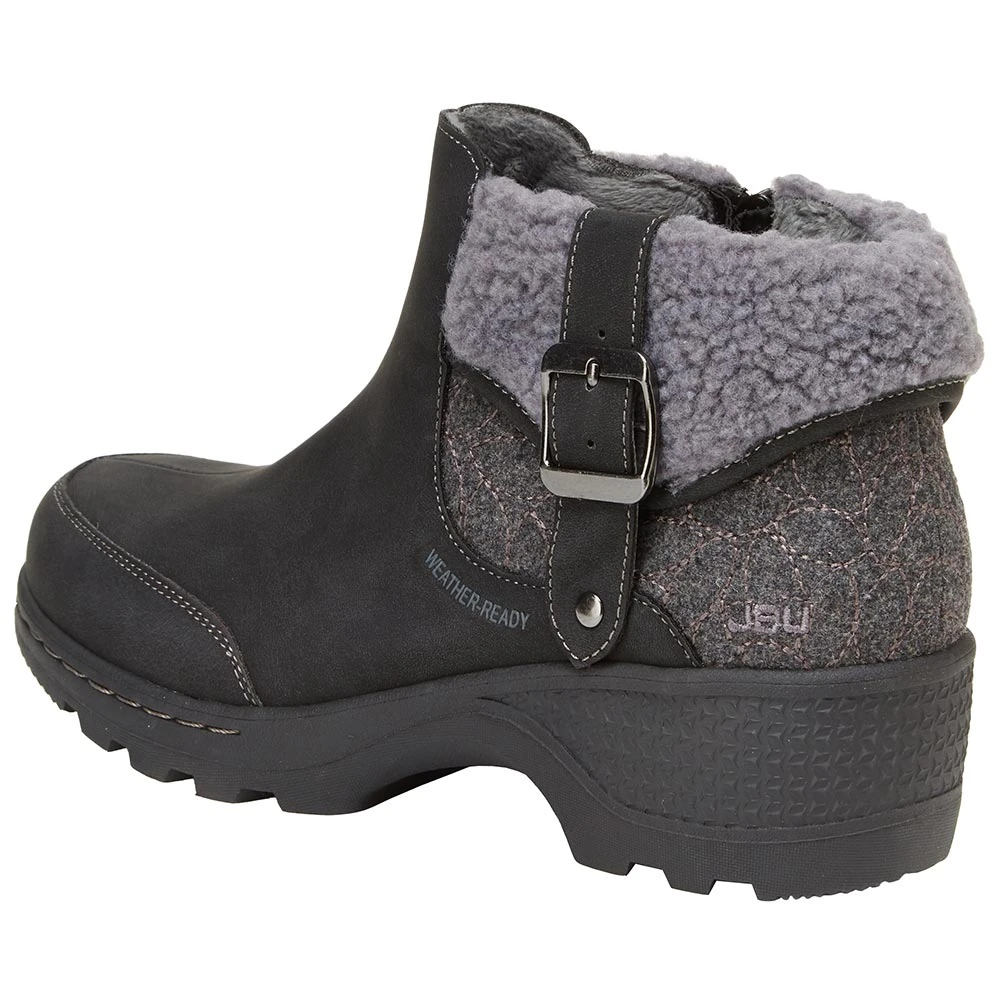 JBU Haven Water Resist Casual Boots – Womens. This cute little boot is coziness personified. JBU has pulled out all the stops with the Haven womens water resistant casual boots. The faux fur collar and buckle accent ensure that the Haven has a place in any stylish wardrobe. The heavy lug All Terra outsole provides traction on a variety of surfaces, wet or dry. Protecting your feet from inclement weather has never looked so good.