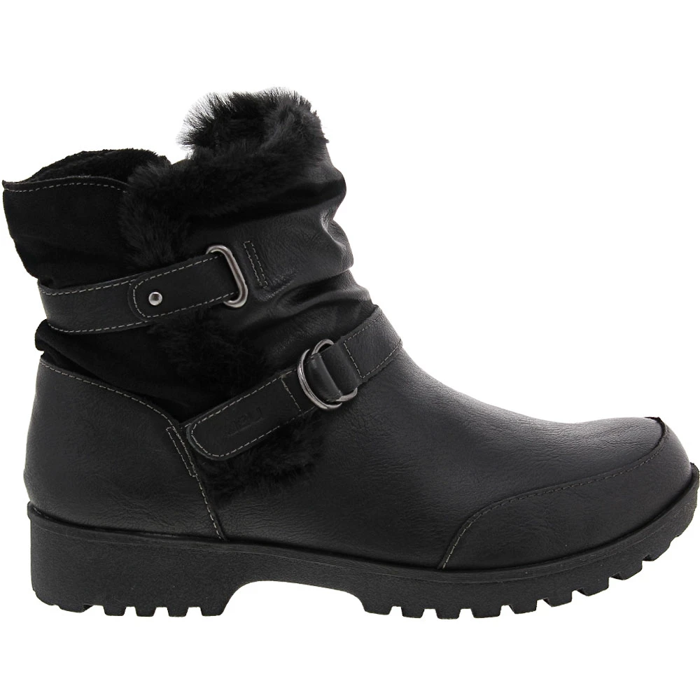JBU Indiana Womens Water-Resistant Comfort Winter Boots. The slouchy upper is accented with buckles and faux fur trim, all of which comes together to create a relaxed and rugged look. Comfort comes easy to this style, which features a water-resistant construction, memory foam insoles, and great non-slip traction sole. The Indiana has been evaluated by the American Podiatric Medical Association (APMA) and has been awarded their Seal of Acceptance for promoting good foot health.