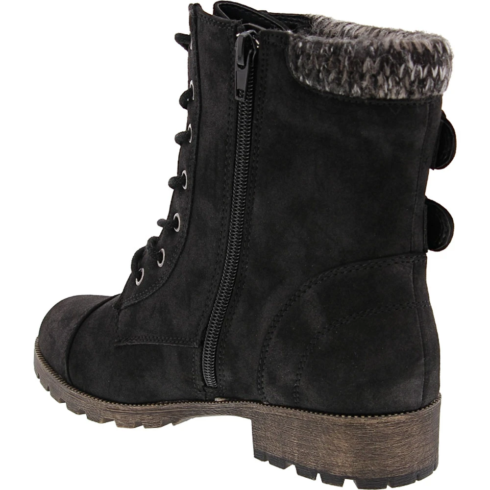 Jellypop Apollo Ankle Boots – Womens. Turn heads with the edgy look of these womens ankle boots. Combat boot style gets feminine accents with the soft knit cuff and buckled strap accents. The rugged TPR outsole provides superior traction while the cushioned latex foam insole keeps you comfortable on your feet. Zip closure with laces gives you a secure fit. These versatile boots pair well with a range of fall and winter fashions and look great with jeans, skirts and casual dresses.