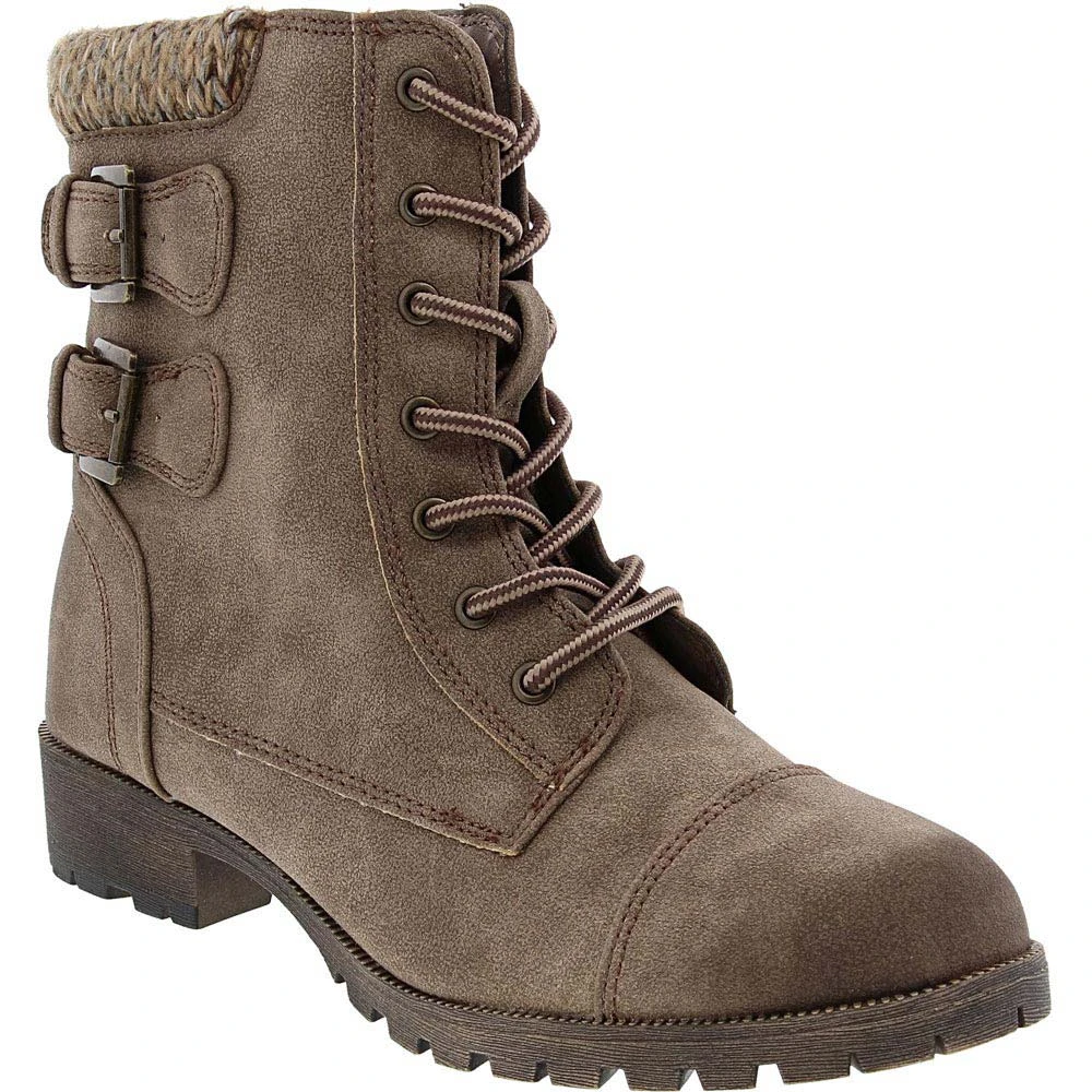 Jellypop Apollo Ankle Boots – Womens. Turn heads with the edgy look of these womens ankle boots. Combat boot style gets feminine accents with the soft knit cuff and buckled strap accents. The rugged TPR outsole provides superior traction while the cushioned latex foam insole keeps you comfortable on your feet. Zip closure with laces gives you a secure fit. These versatile boots pair well with a range of fall and winter fashions and look great with jeans, skirts and casual dresses.