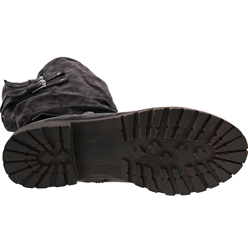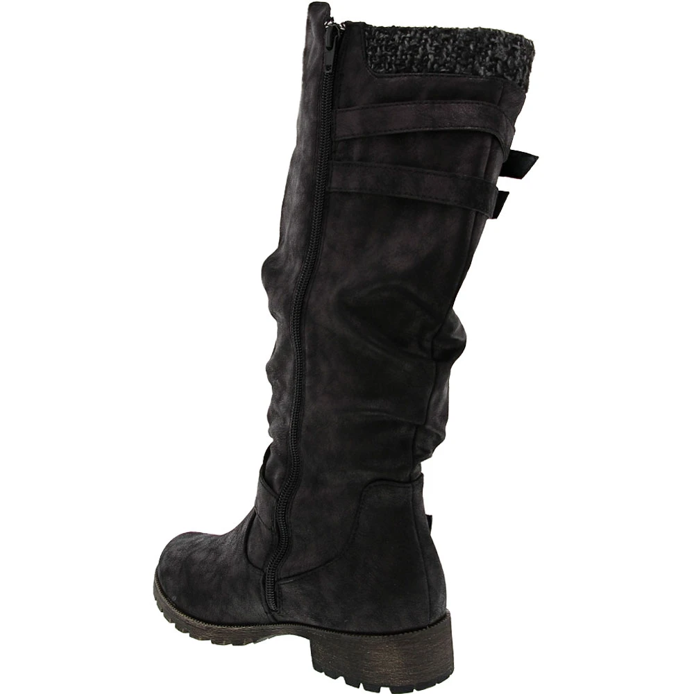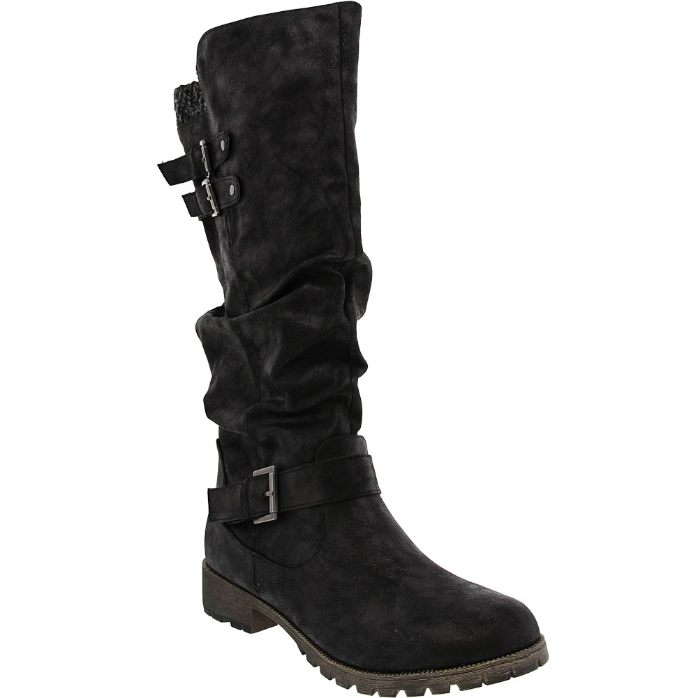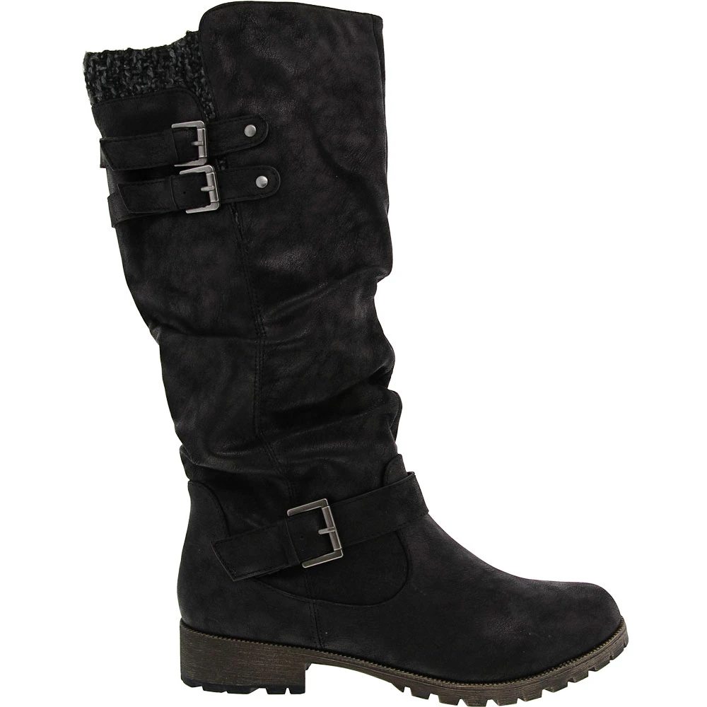 Jellypop Creed Tall Dress Boots – Womens. Make a statement and keep feet comfortable wearing these womens tall dress boots. Chic, trendy and designed for all-day wear, they complement casual and dressier ensembles. These over-the-calf boots have a faux leather upper that is adorned with a knit sweater collar and silver buckle details. A cushioned insole keeps feet comfortable while a durable outsole provides traction when needed. Easy to put on and take off, they have an inside zipper.