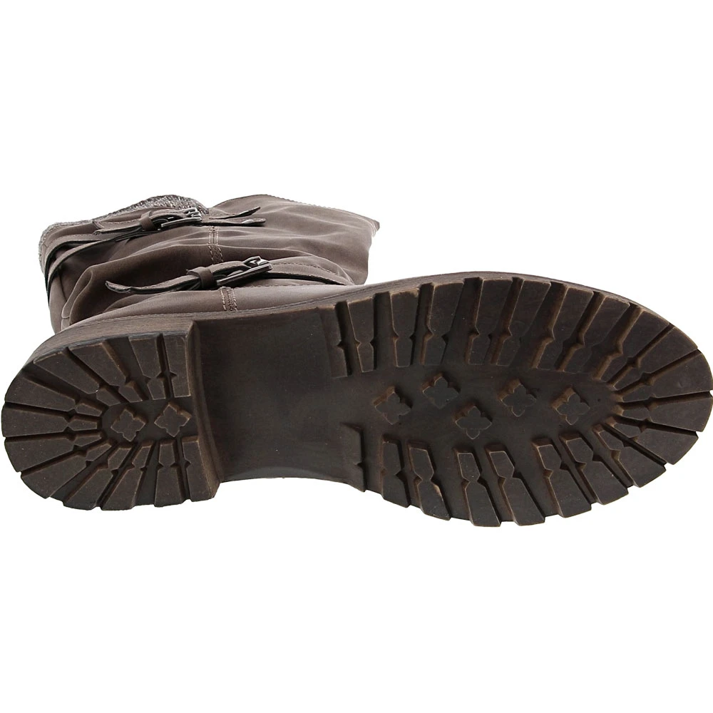 Jellypop Creed Tall Dress Boots – Womens. Make a statement and keep feet comfortable wearing these womens tall dress boots. Chic, trendy and designed for all-day wear, they complement casual and dressier ensembles. These over-the-calf boots have a faux leather upper that is adorned with a knit sweater collar and silver buckle details. A cushioned insole keeps feet comfortable while a durable outsole provides traction when needed. Easy to put on and take off, they have an inside zipper.