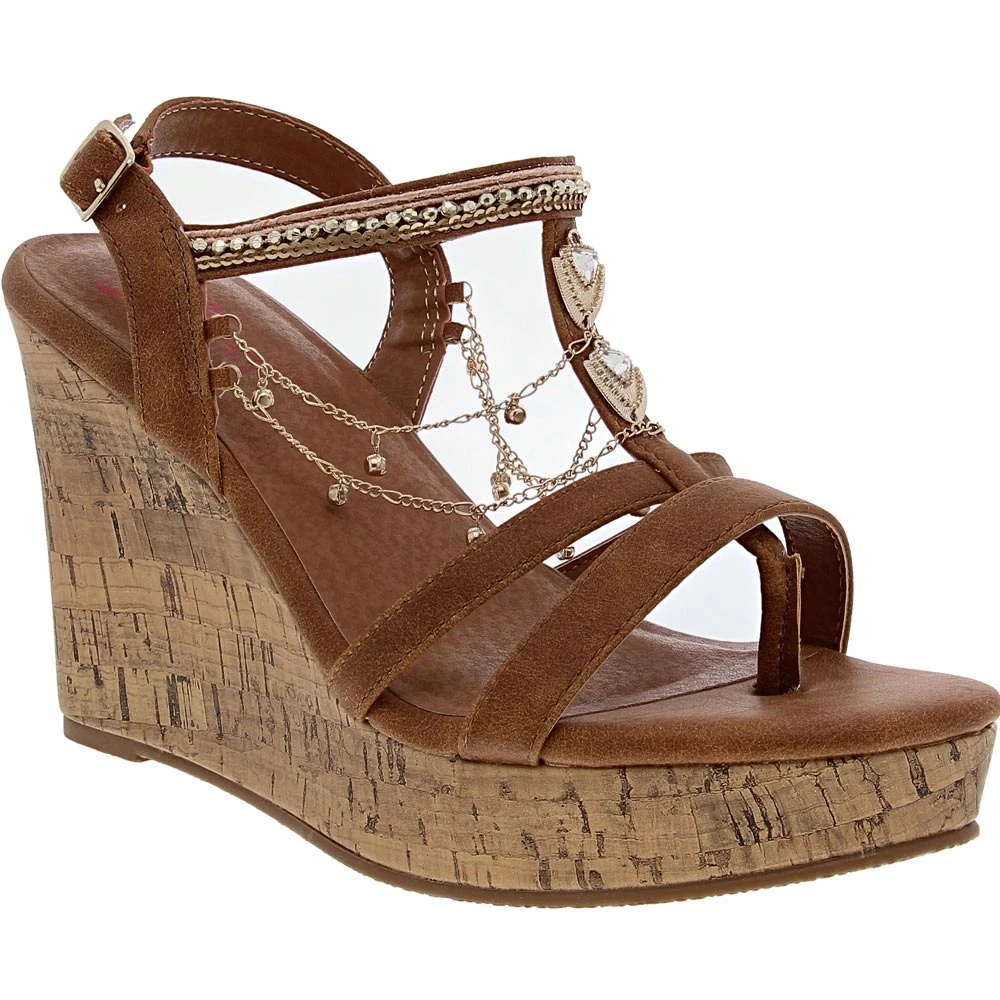 Dazzle things up and show off your stylish flair wearing these womens sandals. Featuring a 4-inch cork wedge heel, they give you unbeatable lift while still being comfortable. The upper features faux-leather straps with metallic accents and dangling chains and jewels, giving your look an extra wow factor. No matter what fun is to be had, the cushioned insole provides all-day comfort while the lightweight outsole provides balance and traction.