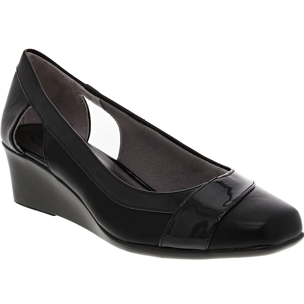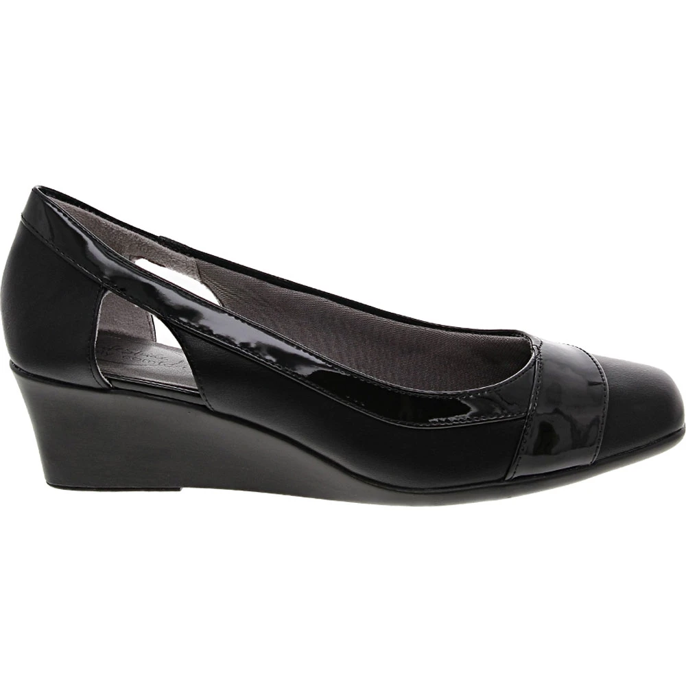 Life Stride has put comfort and style together in their delightful Grandeur womens dress shoes. Grandeur takes the basic pump to a new level with cutouts and faux patent leather trim. The wedge heel is an unexpected modern touch. The cushioned insole will keep your feet happy even on long days. The lightly padded lining caresses your feet and gives them the support they need. Grandeur is great for work or dressy occasions.
