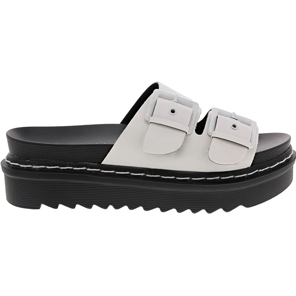Slide into retro summer style by donning these womens sandals. Featuring a rock-style vibe, these slide-ons deliver both flair and comfort to rev up warm-weather fun. They have a faux-leather upper with metal buckle straps. The thick and flexible midsole features contrast stitching and provides a 1.8-inch platform for a touch of height. The footbed is cushioned and contoured to feel soft and natural while the durable lugged outsole provides support and traction.