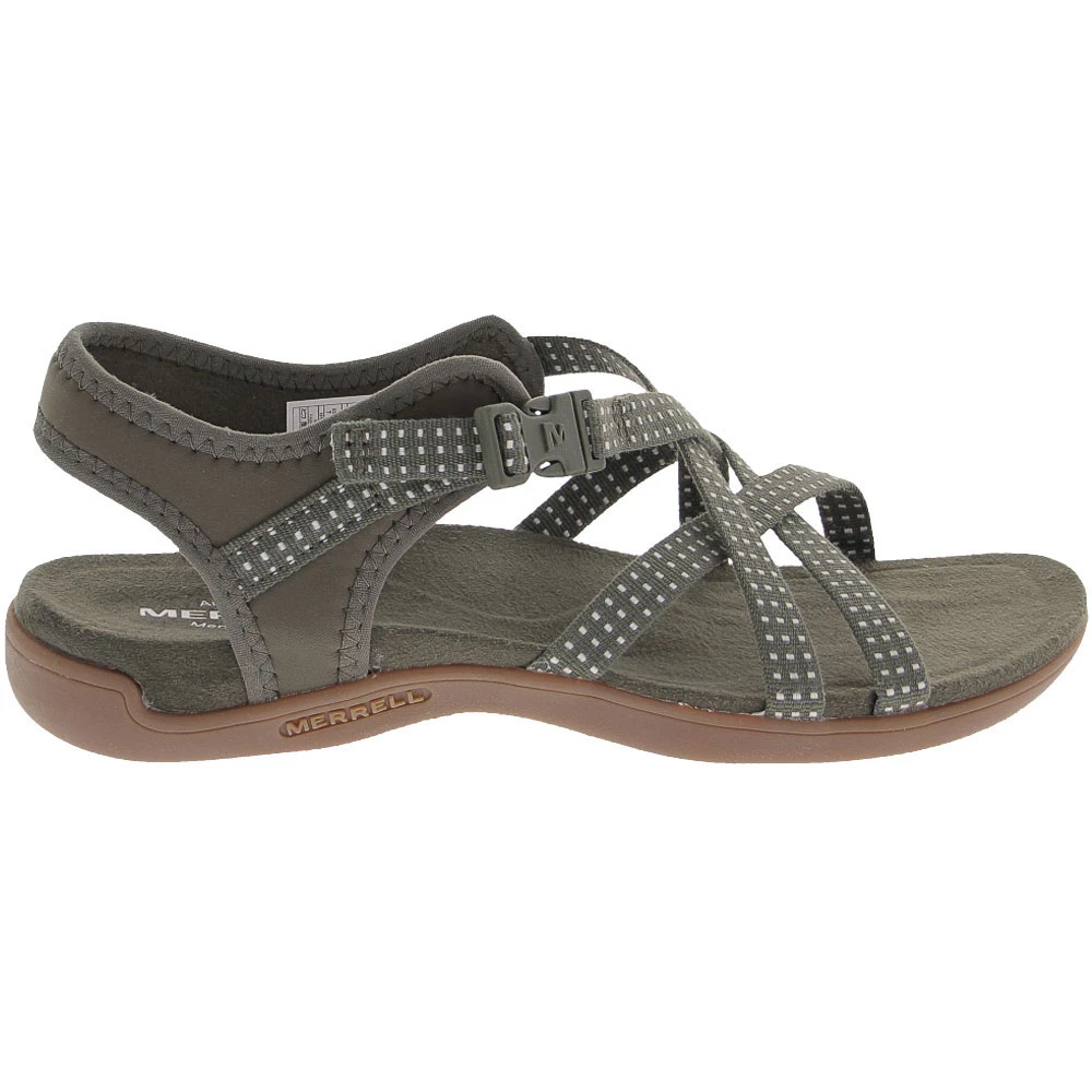 Merrell District Muri Lattice Women’s Sandals. At work or at play these strappy women’s sandals will keep your feet looking good and feeling great all day. The comfort starts the moment you slip your feet into the resilient microfiber wrapped, contoured EVA footbed and Merrell’s air cushioned heel pad. A clip-style buckle adjusts for a snug fit. The lattice style woven upper features a cute dotted pattern for interest and is made of flexible and water-shedding Lycra neoprene.