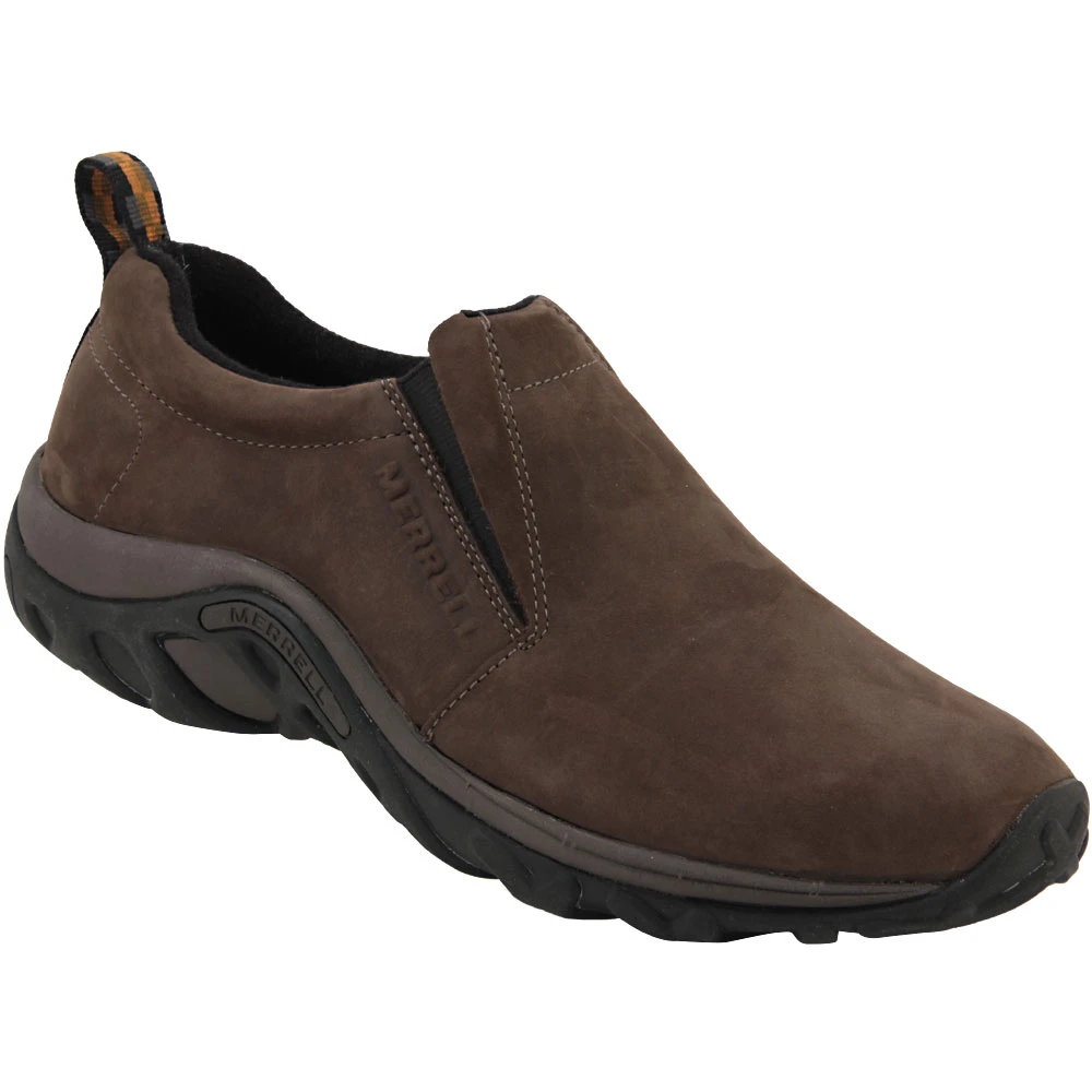 Merrell Jungle Moc Nubuck Womens Slip On Casual Shoes. Stay comfortable and active with the Merrell Jungle Moc Nubuck slip on. A durable nubuck leather upper is lined and treated with Aegis antimicrobial solution to keep these kicks smelling as good as they look. Merrel Air Cushion in the heel absorbs and adds stability. Sticky rubber outsole helps maintain your steady stride.