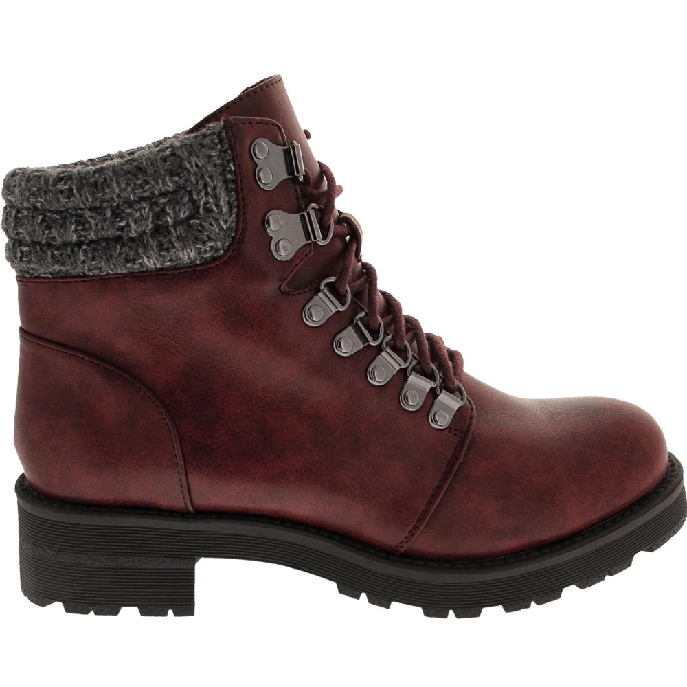 Mia Marlon Casual Boots – Womens. Women with a fun, rugged side will appreciate these womens casual boots. Infused with elements of combat boots and work boots, they bring a spirited accent to casual ensembles. Featuring a durable upper with a sweater accent that adds a feminine flair. Metal loop enclosures give a touch of style to traditional lace-ups. Whether going on an outdoor adventure or enjoying city sights, their durable outsoles will keep you going.