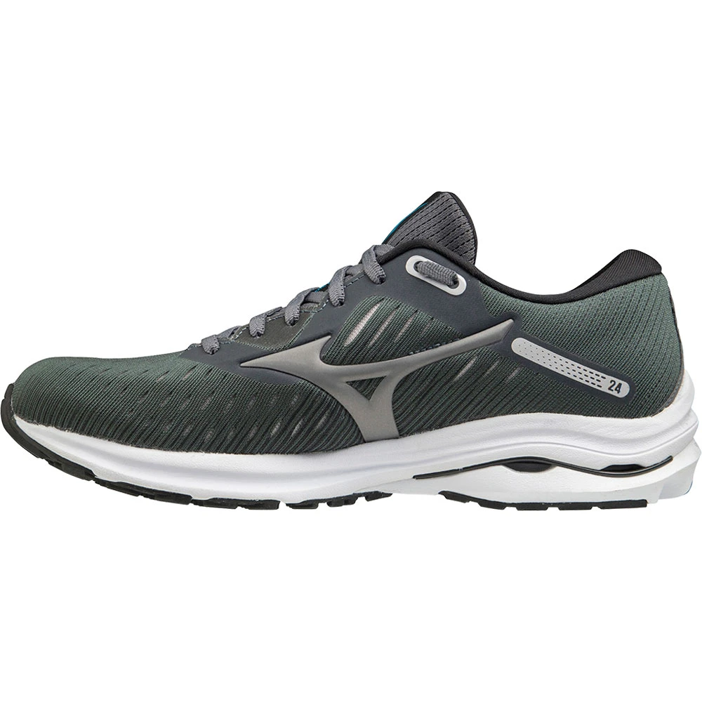Mizuno Wave Rider 24 Womens Running Shoe. The Wave Rider 24 features all new midsole material – MIZUNO ENERZY (FOAM), that provides 15% increase in rebound and 17% increase in softness. The upper has a new lightweight engineered mesh with a non- stitch Runbird logo that provides a nice and clean look that gets out of your way as you run. New sole construction by connecting more MIZUNO ENERZY (FOAM) in to the midfoot of the shoe for an update to the Smoothride technology.