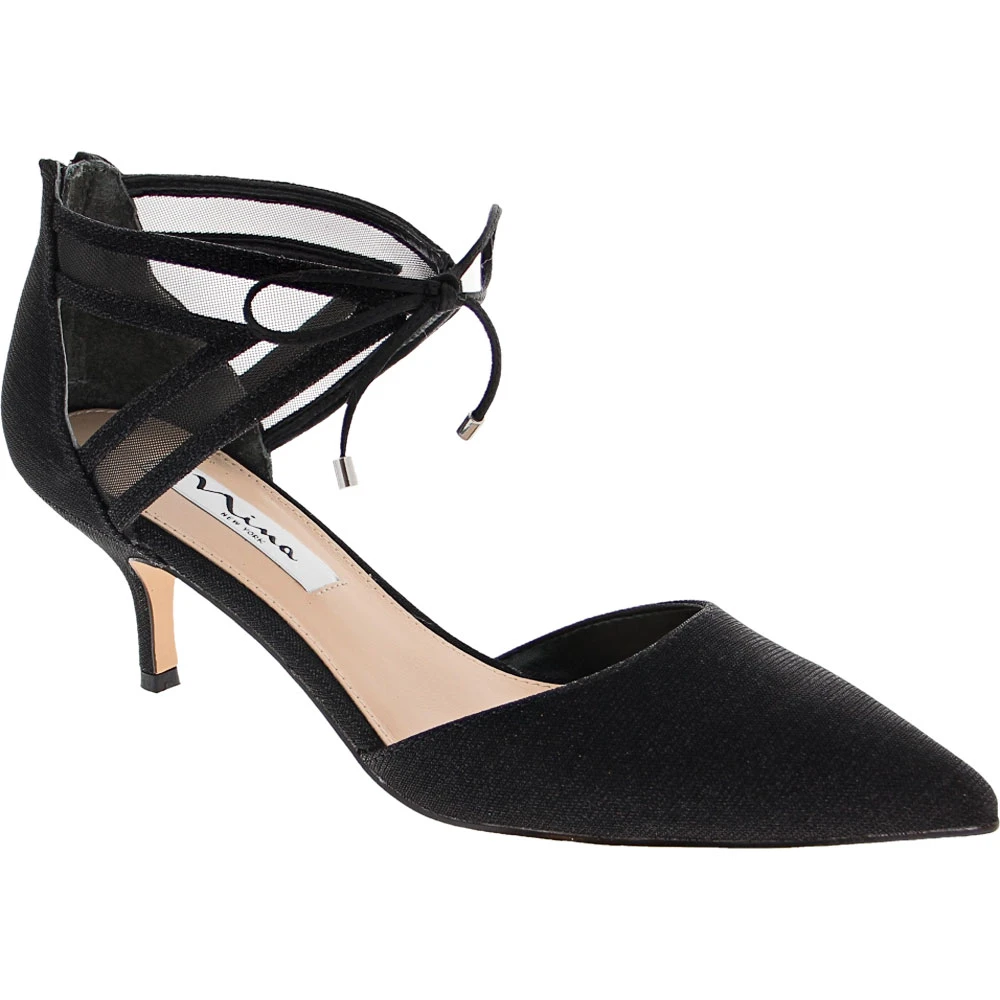Nina Talley Prom Dress Shoes – Womens. Shine bold and bright with the chic and classy Nina Talley dress pump. Shimmery fabric uppers meet a wrapped mini kitten heel for an effortlessly polished silhouette. This pointed-toe shoe also features an ankle strap with suede and mesh cutout details, along with a back zipper and bow tie closure that are both charming and practical. A lightly padded footbed and smooth synthetic linings add comfort to your stride.