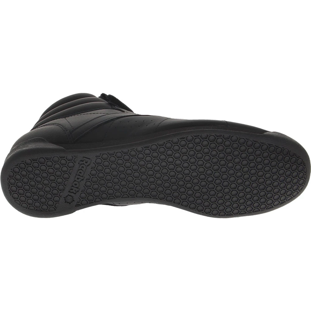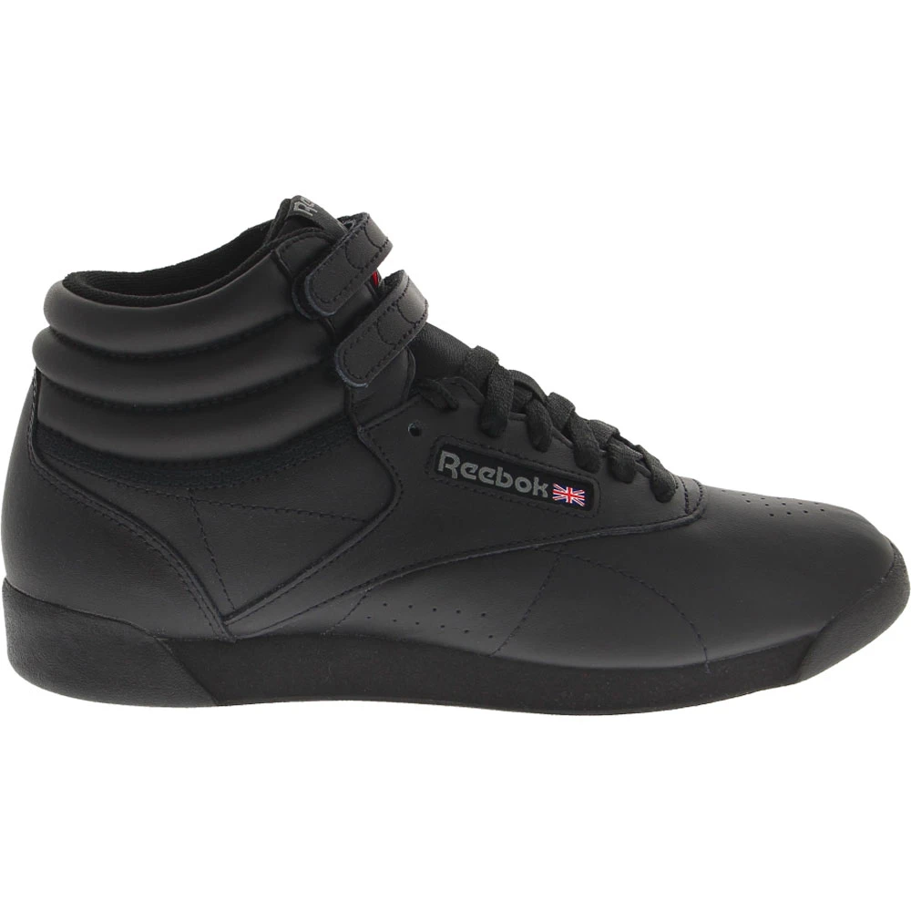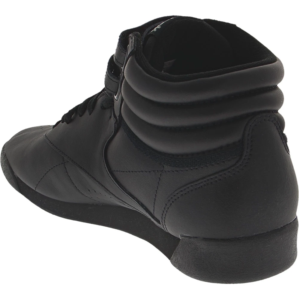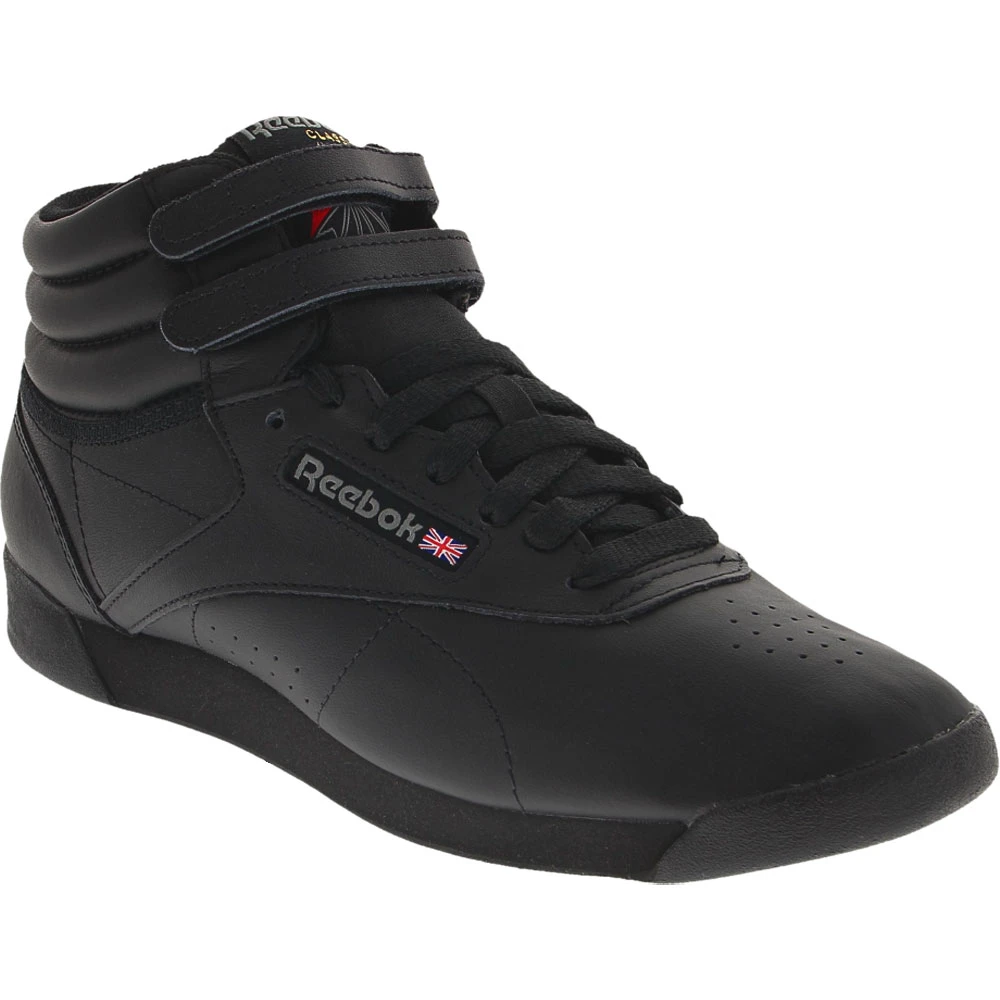 Reebok Freestyle Hi Womens Athletic Shoes. Reebok Freestyle Hi Womens fitness shoe makes a great addition to your active lifestyle. Soft, garment coated leather upper with a double adjustable ankle strap for a custom fit. The unique lacing system allows for a snug fit which gives you stability and support. Padding around the ankle collar and the use of coated leather for support and added comfort. EVA midsole and terry cloth lining provide lightweight cushioning so you keep moving long after others have stopped. High abrasion rubber outsole for traction and durability.