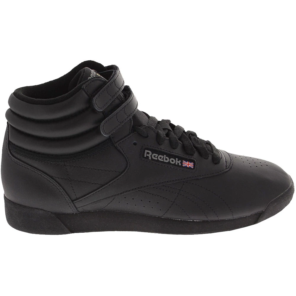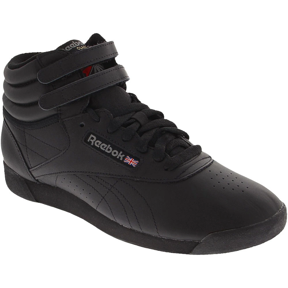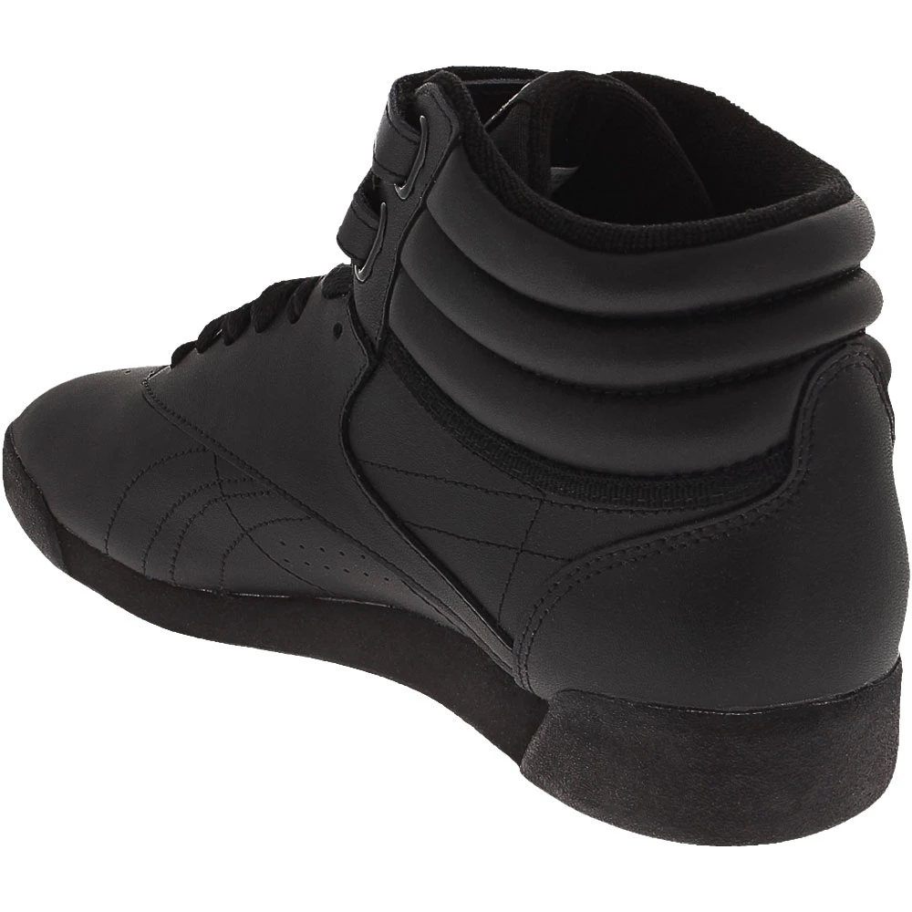 Reebok Freestyle Hi Womens Athletic Shoes. Reebok Freestyle Hi Womens fitness shoe makes a great addition to your active lifestyle. Soft, garment coated leather upper with a double adjustable ankle strap for a custom fit. The unique lacing system allows for a snug fit which gives you stability and support. Padding around the ankle collar and the use of coated leather for support and added comfort. EVA midsole and terry cloth lining provide lightweight cushioning so you keep moving long after others have stopped. High abrasion rubber outsole for traction and durability.