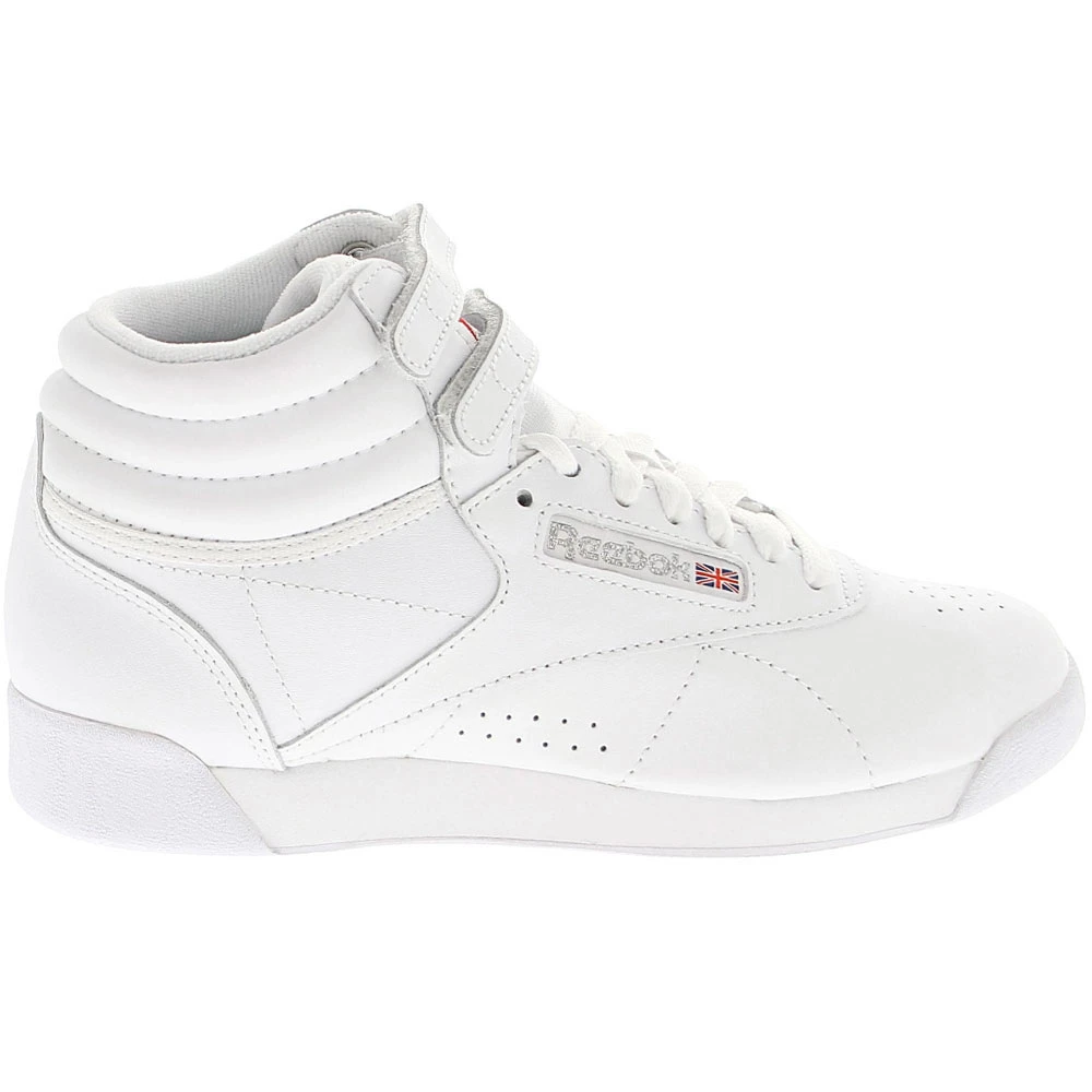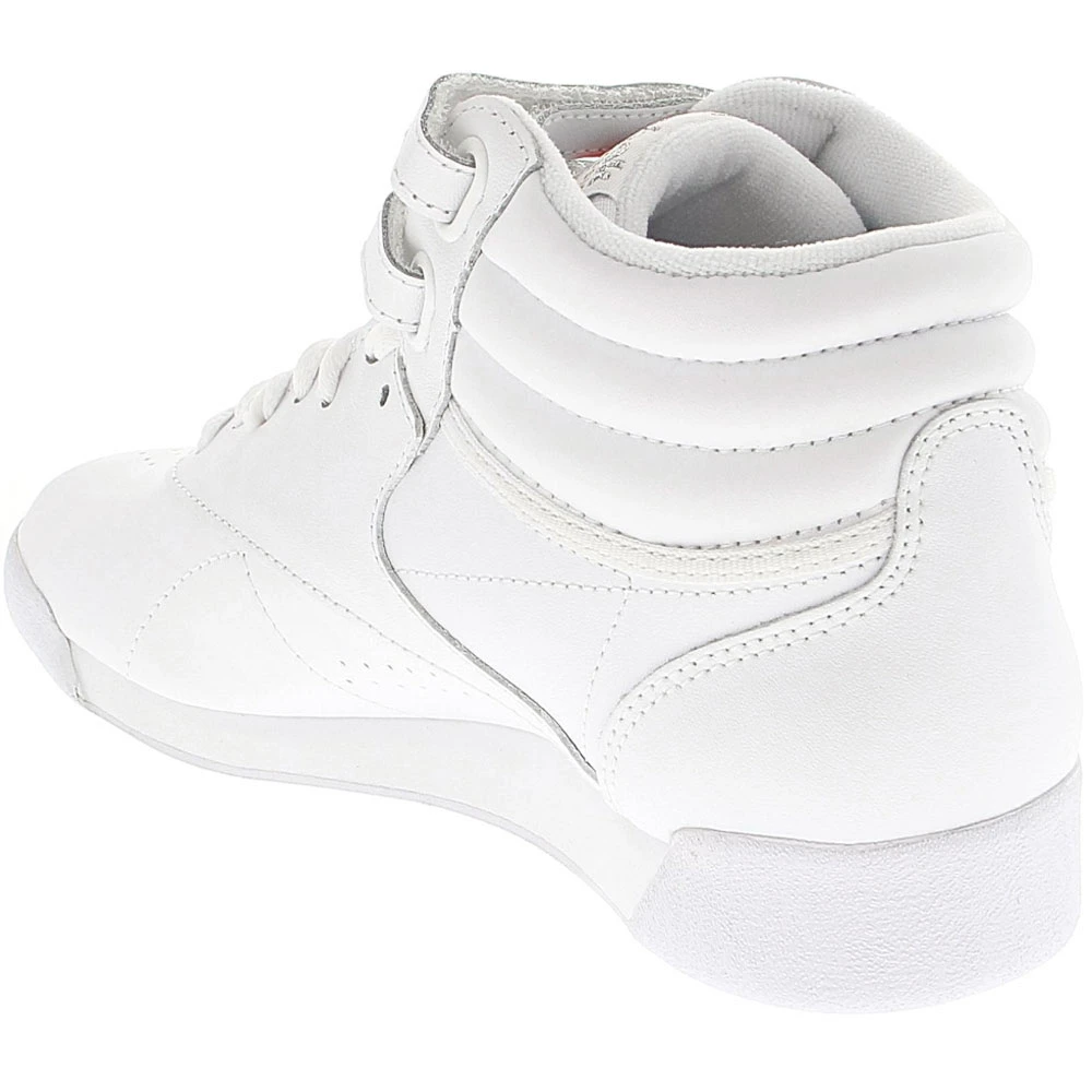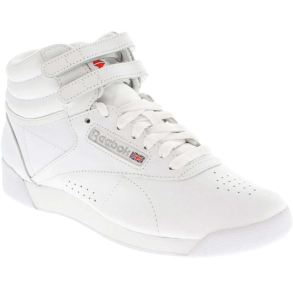 Reebok Freestyle Hi Womens Athletic Shoes. Reebok Freestyle Hi Womens fitness shoe makes a great addition to your active lifestyle. Soft, garment coated leather upper with a double adjustable ankle strap for a custom fit. The unique lacing system allows for a snug fit which gives you stability and support. Padding around the ankle collar and the use of coated leather for support and added comfort. EVA midsole and terry cloth lining provide lightweight cushioning so you keep moving long after others have stopped. High abrasion rubber outsole for traction and durability.
