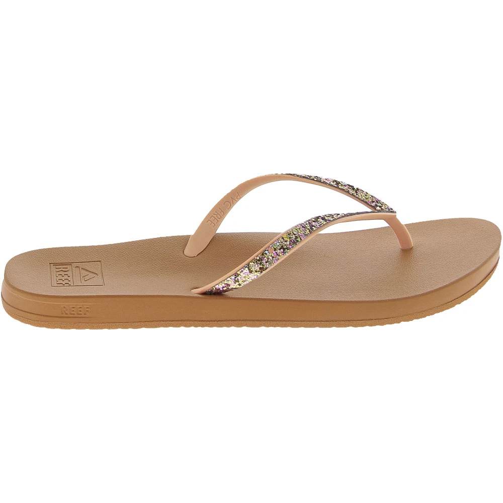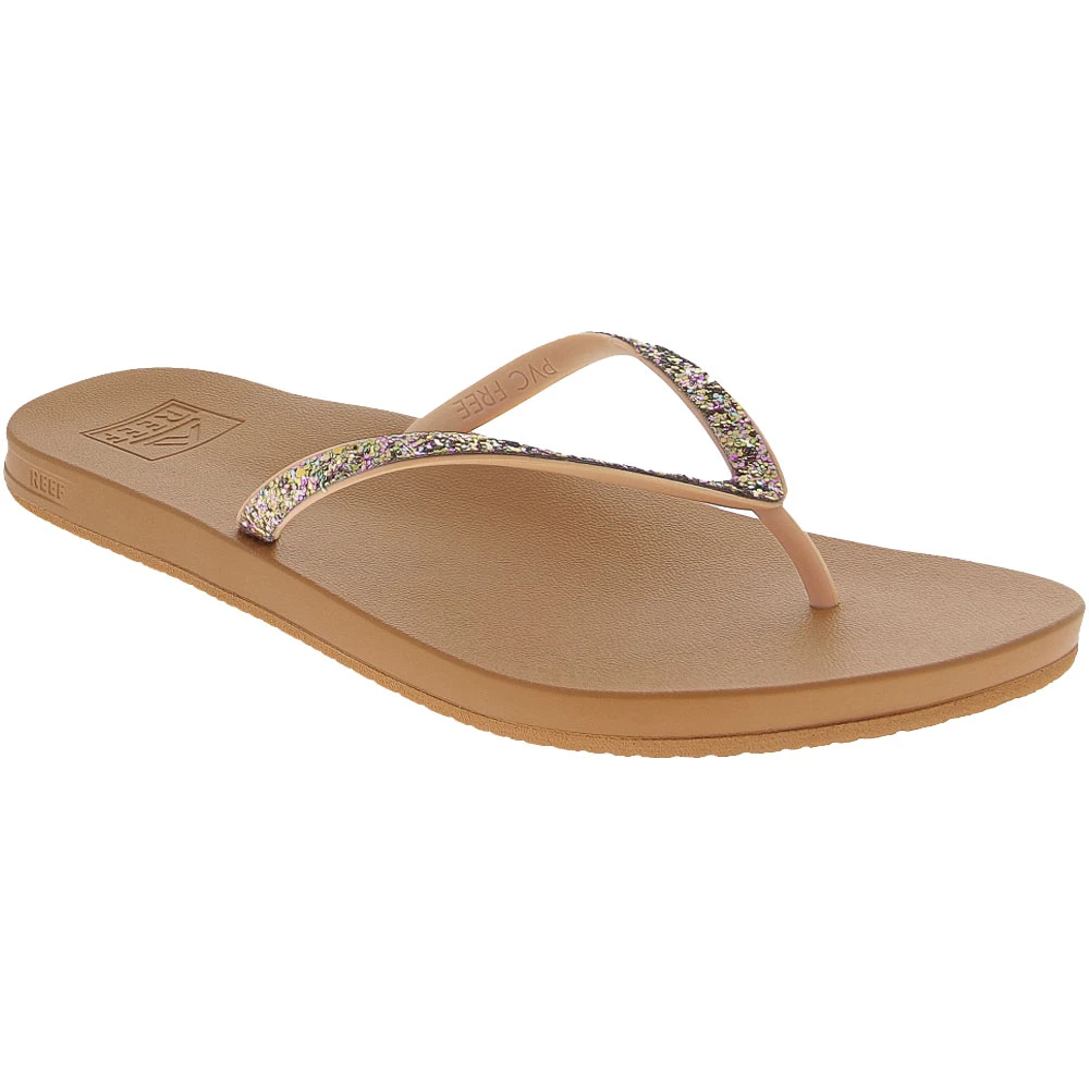 Reef Cushion Bounce Stargaz Women’s Flip Flops. The Cushion Bounce Stargazer Women’s Flip Flop Sandals introduce style and comfort together to give you the best of both worlds. The slim faux leather upper is contoured with a soft EVA footbed for arch support and Reef’s signature bounce foam catches and cushions every step. The rubber sponge outsole is molded with a swell design to maximize traction. Straps come with finished edges and a chic glitter overlay.