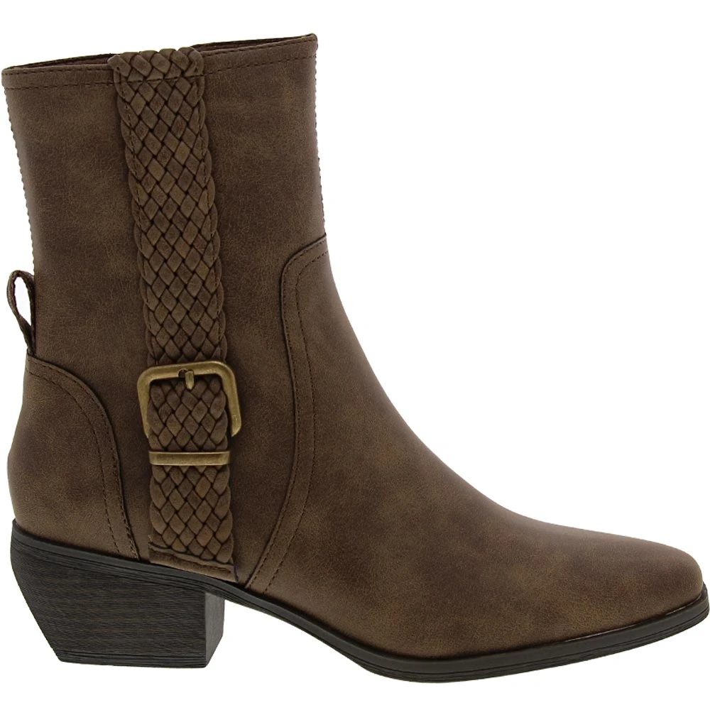 Add western flair to your look while exuding classy sophistication by wearing these womens casual boots. Trendy ankle boots with a classic silhouette that has a modern vibe thanks to a braided strap and metallic buckle on the side. Featuring a hidden side zipper and a memory foam insole that keeps feet cushioned and comfortable all day. The block heel gives you a touch of height while the rubber outsole offers optimal traction.