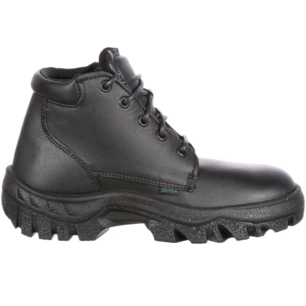 Rocky Tmc Postal Duty Chukka Women’s Steel Toe Work Boots. You should demand comfort and confidence from your womens steel toe boots. Made with high quality materials, these boots are designed for tough work. The cushioned footbed provides comfort, circulation and durability. Enjoy a workday with no aches and pains. Perfect for the work environment, these boots feature a slip and oil resistant TPU outsole. Composed of solid black, full grain leather, it retains a professional appearance while staying waterproof.