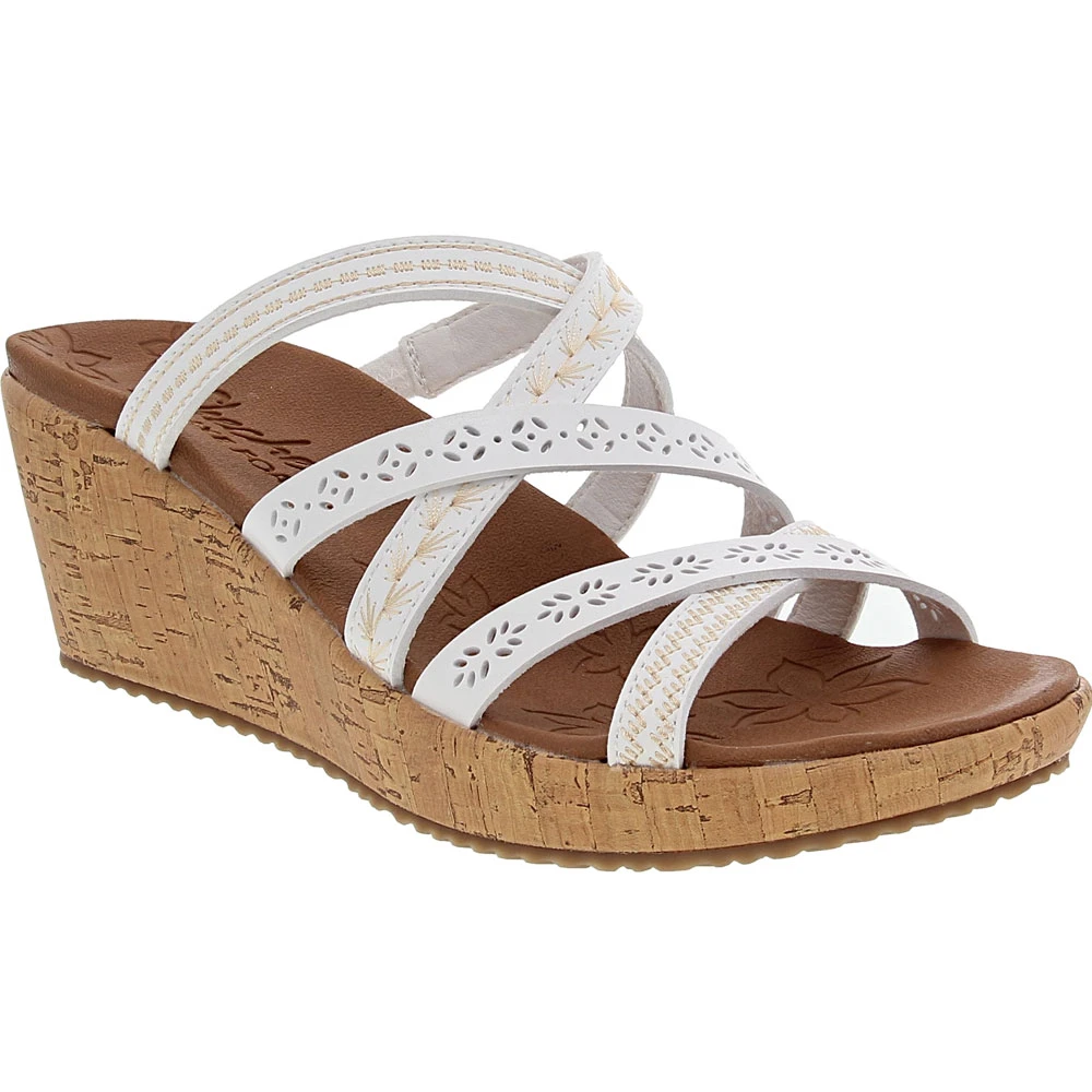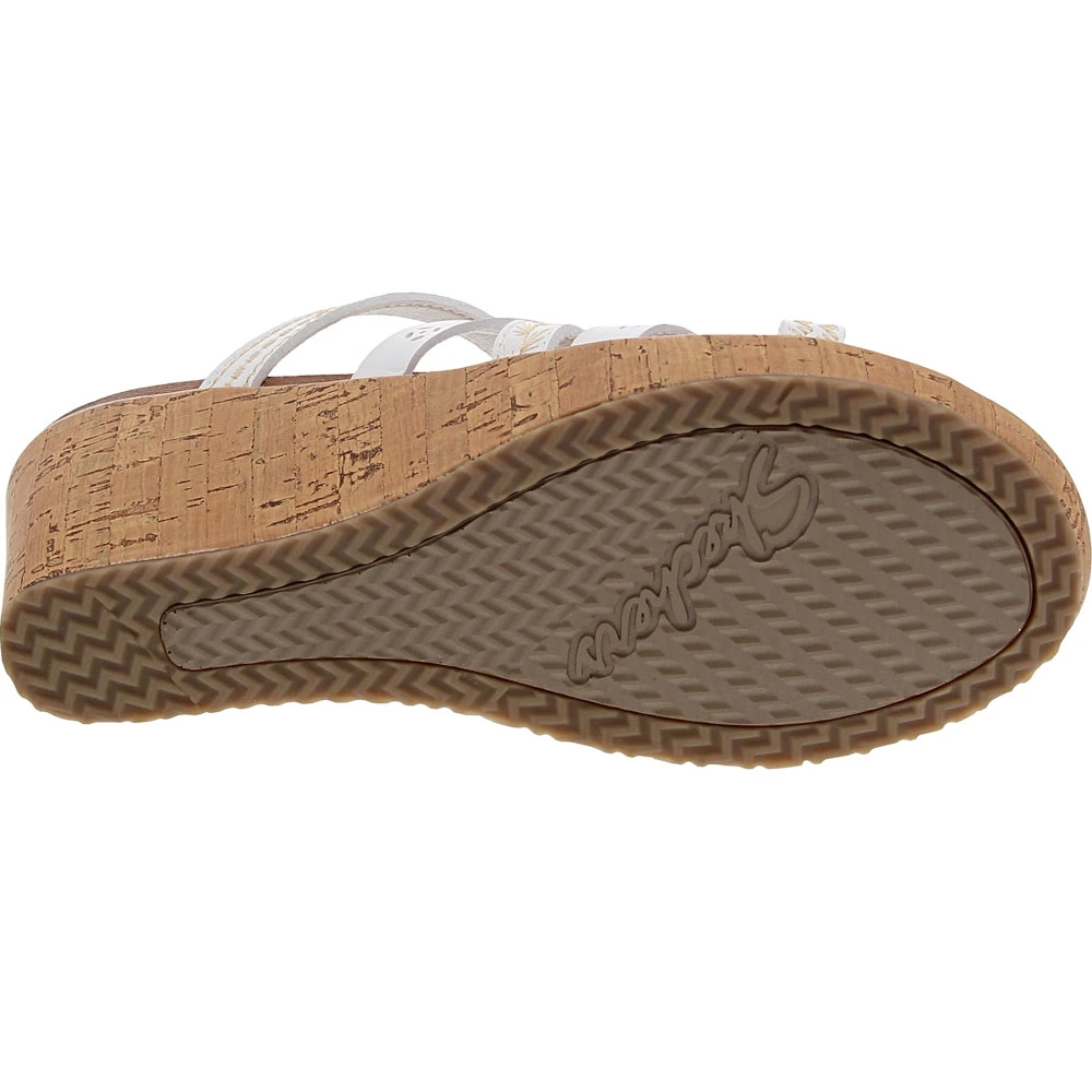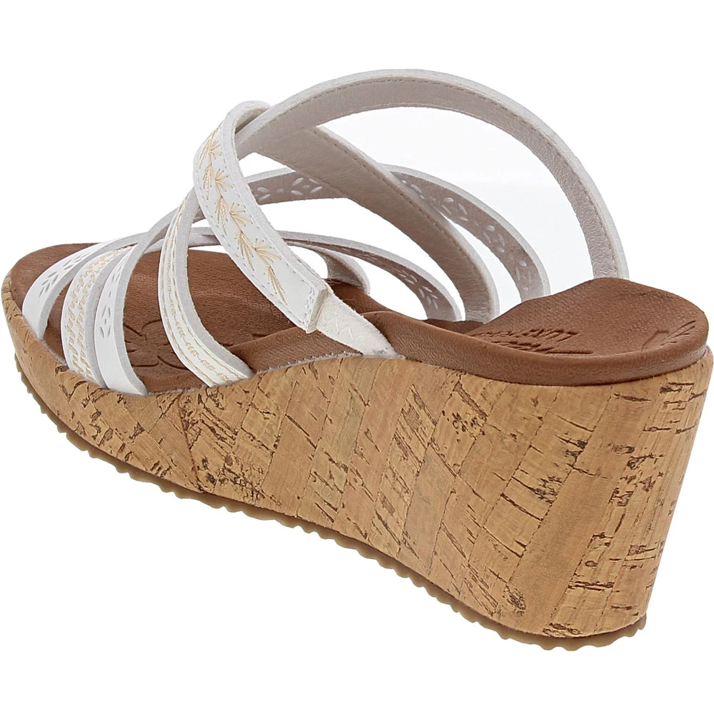 Skechers Beverlee Tiger Posse Womens Wedge Sandals. Bring style with you everywhere wearing the SKECHERS Beverlee sandal. Embroidered synthetic upper in a wedge fashion strappy slide sandal with cork wedge heel and Luxe Foam footbed.
