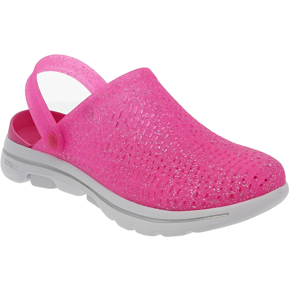 These womens clogs blend fun and comfort into one festive shoe. The Foamies: Skechers GOwalk 5 – Ocean Glow is designed for women who love a little sparkle in their lives. With a metallic glitter finish on their sculpted Foamies upper, these clogs light up any room with their lively sheen. High-rebound Comfort Pillar Technology and responsive Ultra Go cushioning ensure your feet feel as fresh as they look.