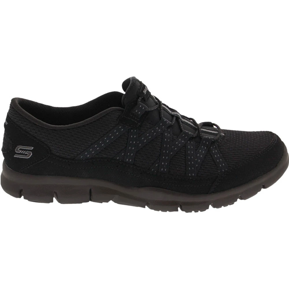 Skechers Gratis Strolling Women’s Life Style Shoes. Walking is a pleasure in these comfortable yet stylish walking shoes. The upper is mesh with perforated faux suede accents, offering breathability and a little cooling action. It also features a fabric overlay on the sides, creating the look of diamond-shaped cutouts for extra style. The midsole absorbs shock, and the insole is made of Air Cooled Memory Foam for comfort. These shoes have a slip-on construction with a bungee laced instep.