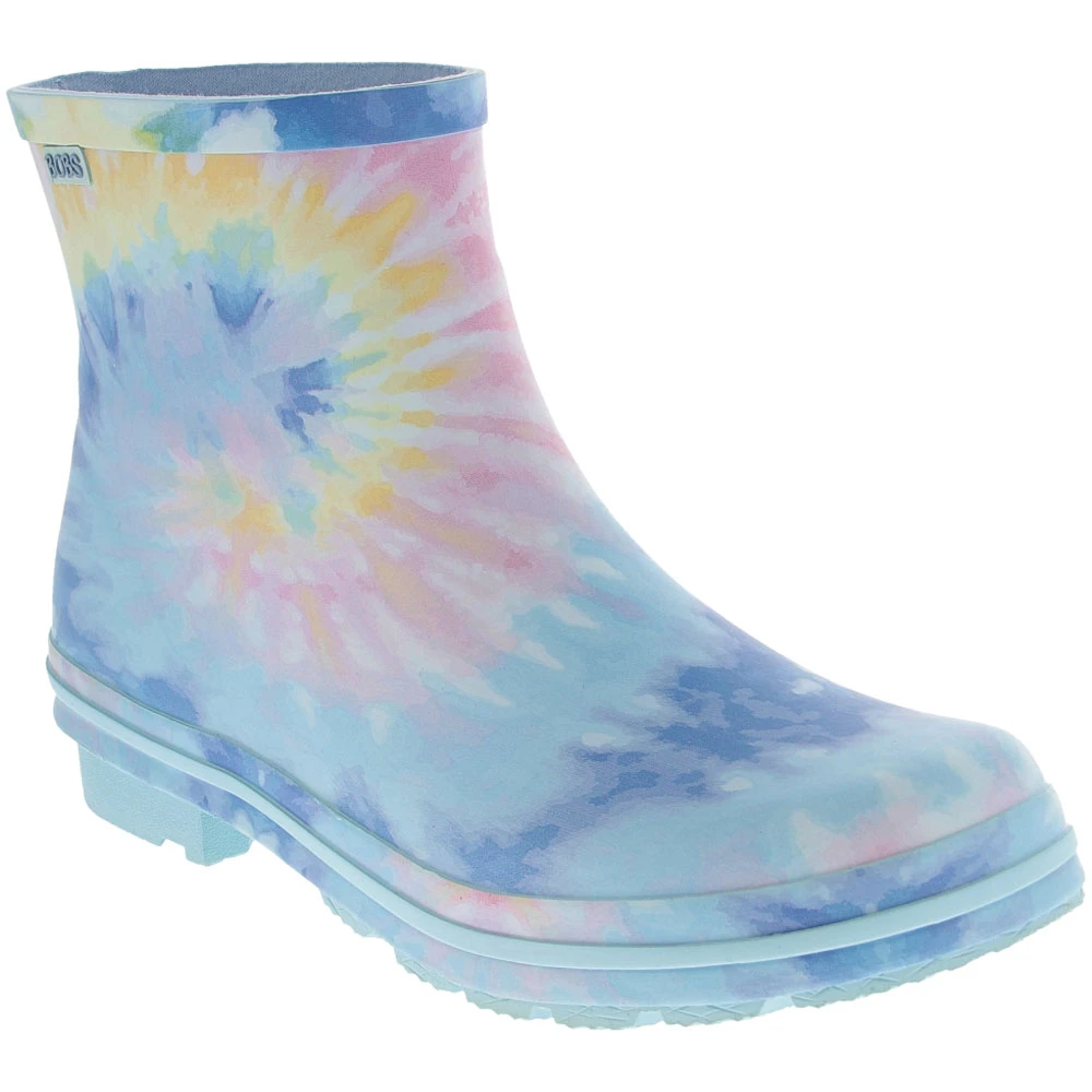 Splash around all you want while exuding a fun, colorful style in this pair of waterproof womens rain boots. Featuring a refreshing tie-dyed print that makes them stand out from the crowd. Whether doing outdoor chores or running errands on a rainy day, they are made with a soft, flexible rubber that moves with your every step. They have a breathable, moisture-wicking lining that makes them suitable for all-day wear and a durable, grippy outsole.
