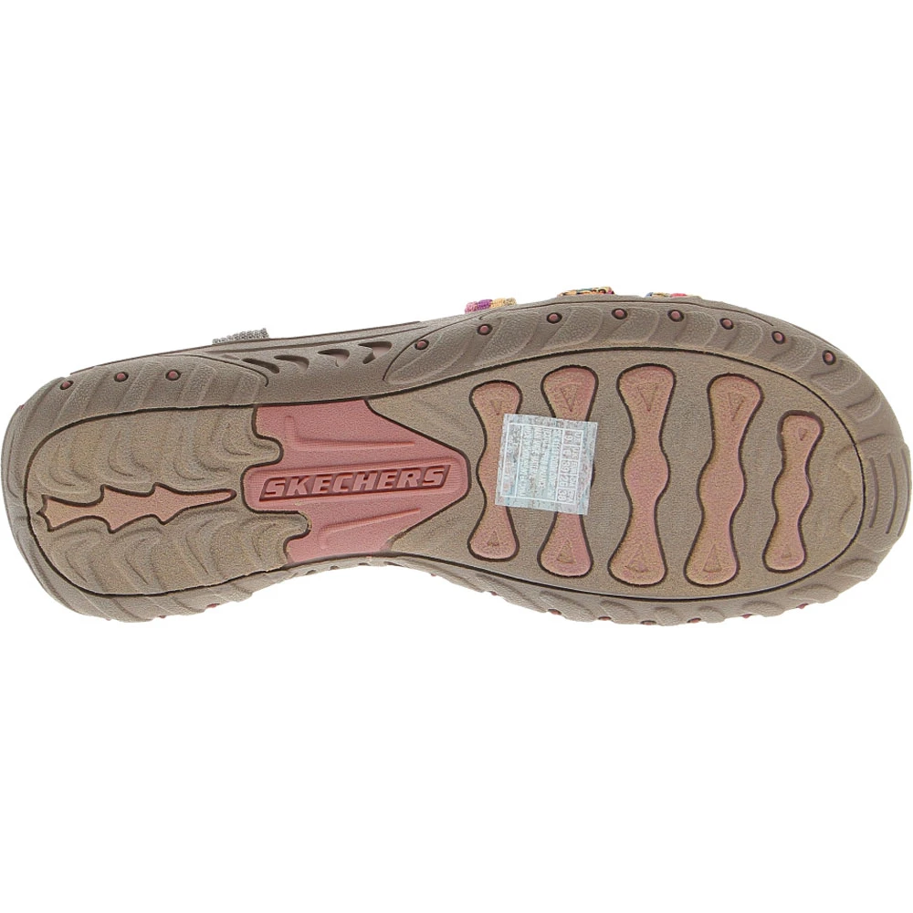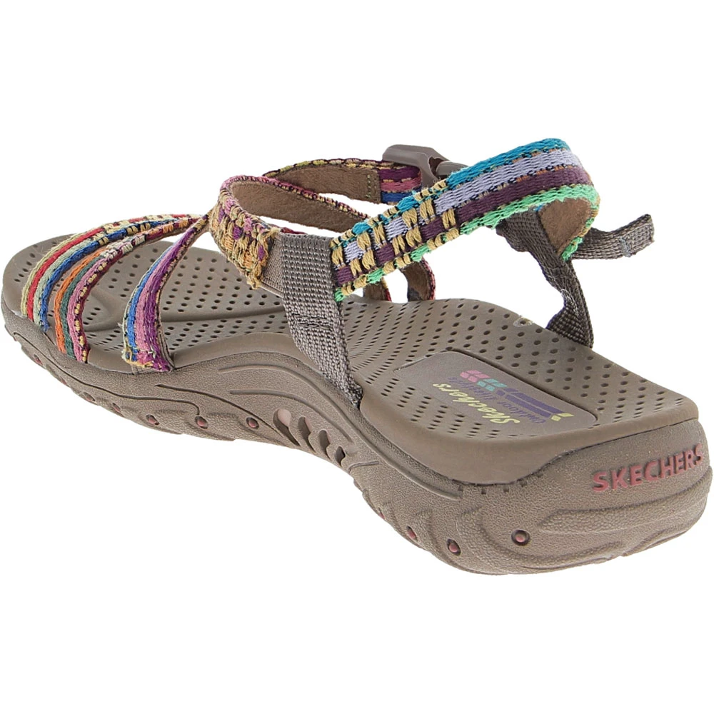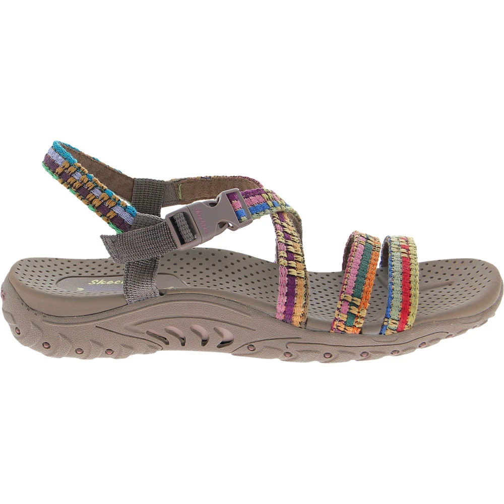 Skechers Reggae Sew Me Sandals – Womens. Colorful comfort could be yours with Skechers’ Reggae Sew Me womens sandals. They feature fun multicolored uppers with ankle straps and durable outsoles for all-day wear. The cushioned footbeds are designed to help you walk extra miles in comfort during your busy day.