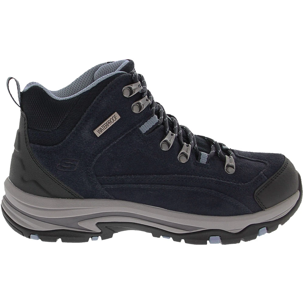 Skechers Trego Alpine Trail Waterproof Hiking Shoes – Womens. Hit the trails with confidence and style in these womens hiking shoes. They have a trendy silhouette while still meeting your outdoor adventure needs. These lace-up low tops feature a waterproof suede upper with mesh for breathability, ensuring feet stay dry and comfortable. A memory foam insole cushions each step, helping you focus on the experience. No matter what terrain the path has in store for you, the durable, high-grip outsole is designed for optimal traction.