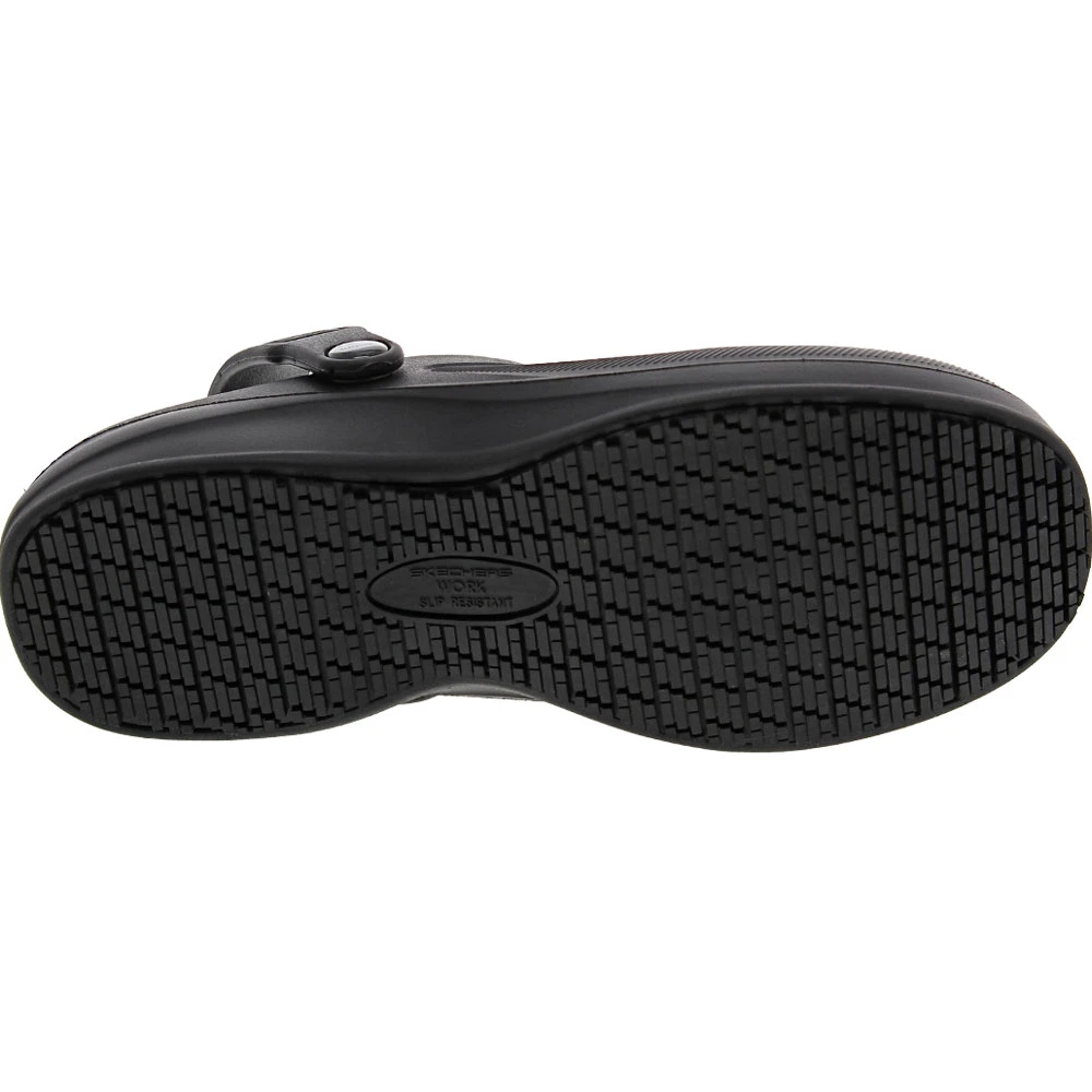 Slip on this comfortable pair of Skechers Work womens soft toe work shoes that feature a clog-style with a movable back strap. Excellent arch support stabilizes your feet to provide you with the ultimate in all-day comfort, while the outsole guards against injuries from slipping on wet surfaces. The textile lining feels soft against your skin and prevents a buildup of blisters.