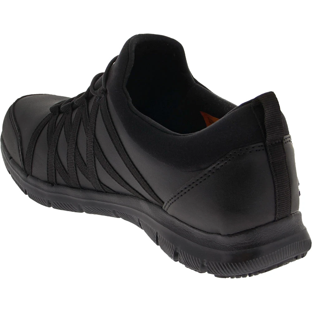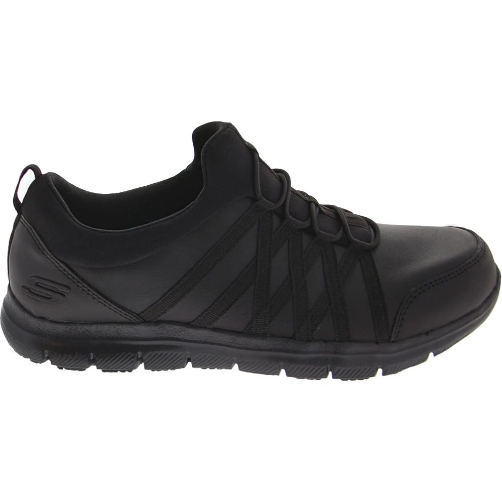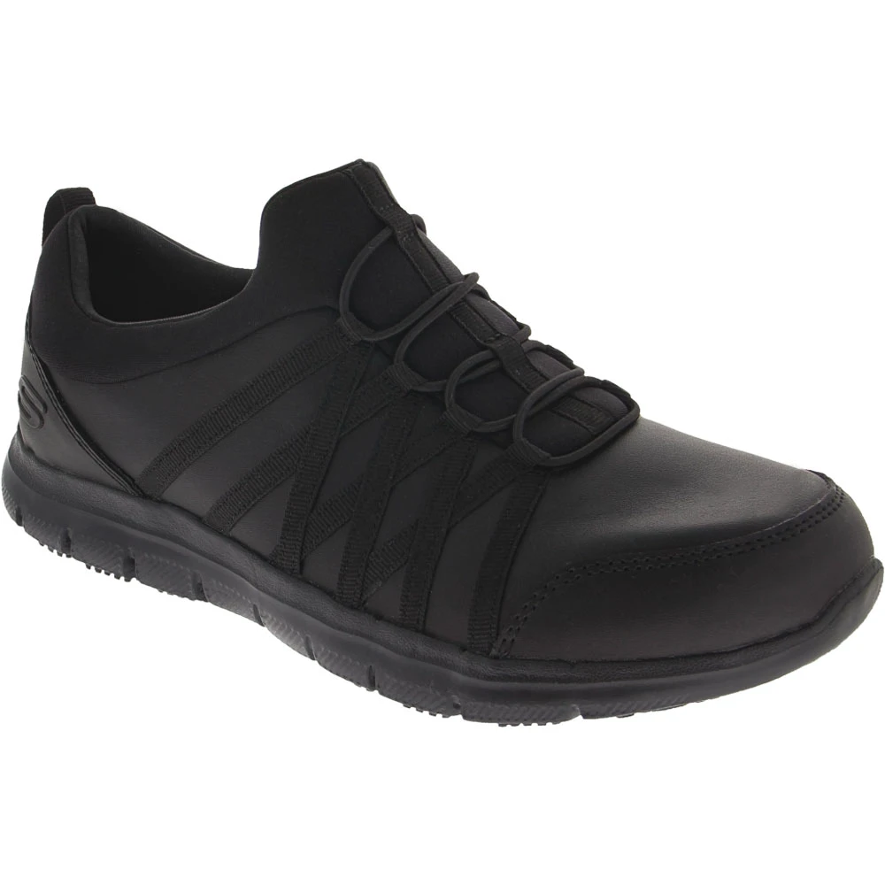 Skechers Work Dagsby Non-Safety Toe Work Shoes – Womens. Skechers Work’s Ghenter-Dagsby womens soft toe work boots starts with a sporty low-profile sneaker design and adds soft fabric linings, memory foam comfort insoles and flexible shock-absorbing midsoles for lightweight cushioned support. The Ghenter-Dagsby’s Relaxed Fit design, slip-on construction, stretched lace-up front panels and bungee laces provide a flexible and comfortable fit. Slip-resistant rubber traction outsoles ensure steady footing on slick surfaces.