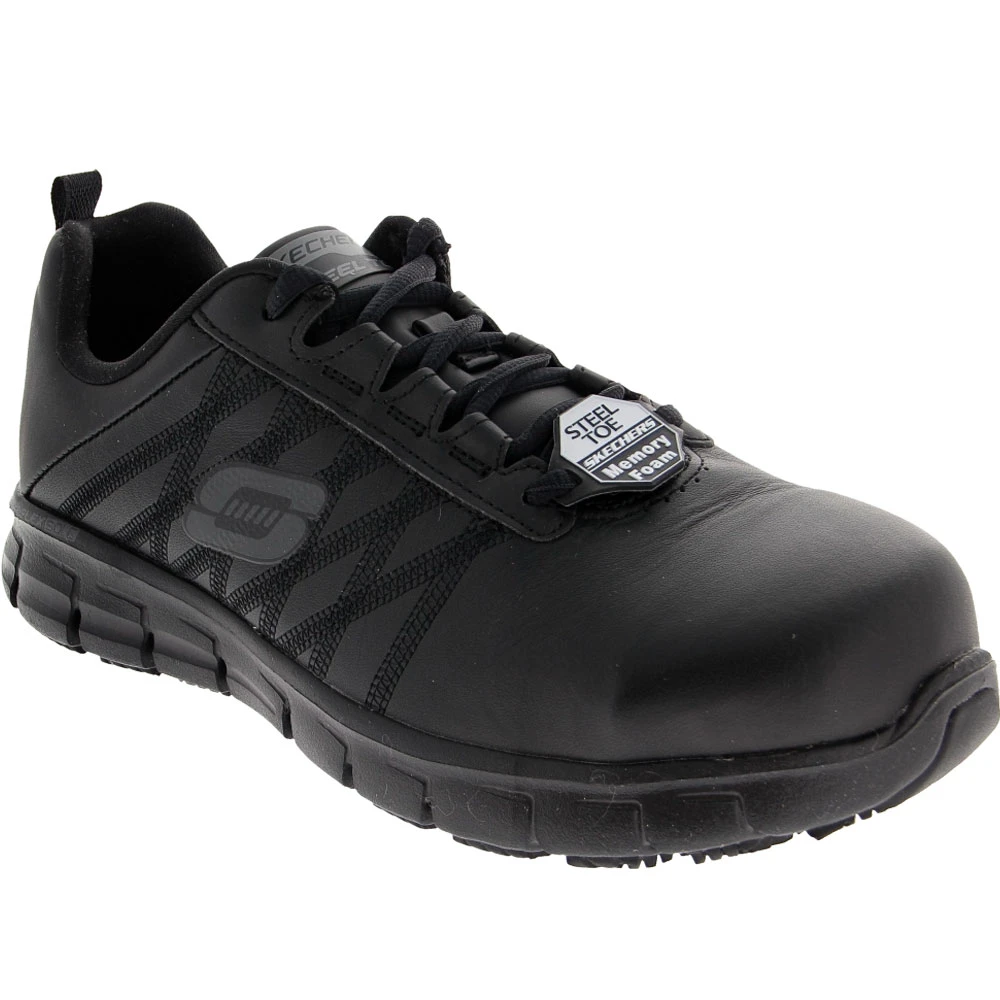 Skechers Work Martley Women’s Safety Toe Work Shoes. Look great and stay well protected when you choose the Sure Track Martley Steel Toe Shoe from Skechers’ Work collection. Supple leather makes for high-quality uppers, while FlexSole technology works to limit underfoot shock. A rugged rubber outsole grips varied surface types with confidence, as the padded tongue and collar protect against fatigue during long days on your feet.
