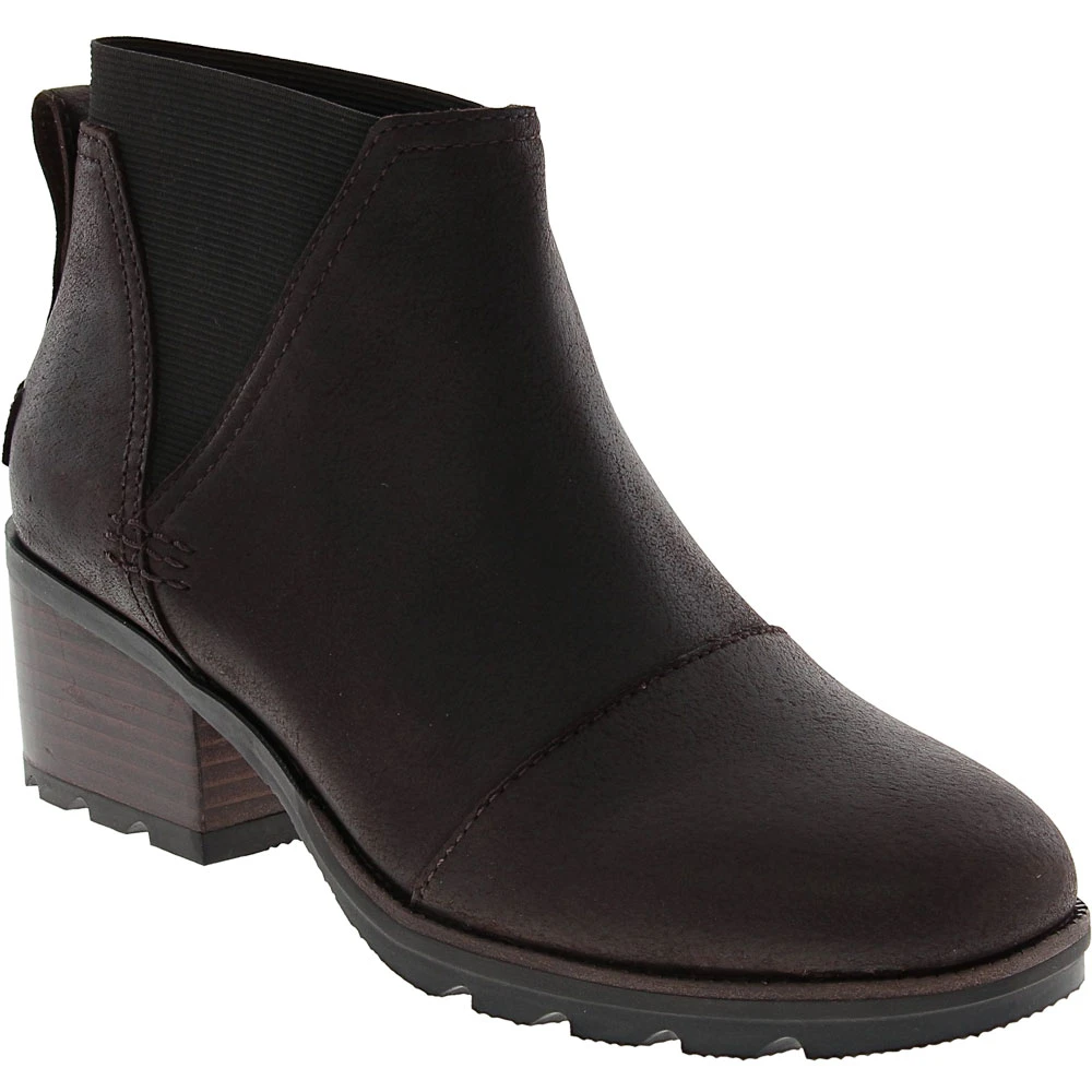 Sorel Cate Chelsea Ankle Boots – Womens. These womens ankle boots make being weather-resistant trendy and chic. Easy to slip on and off, the soft leather upper features elastic gore panels, pull-tabs on the back and stylish stitching that add to their comfort and appeal. Your feet will be kept cushioned all day thanks to a lightweight EVA footbed that is removable. The leather-lined block heel gives a classy flair that is complemented by a durable outsole designed for traction.