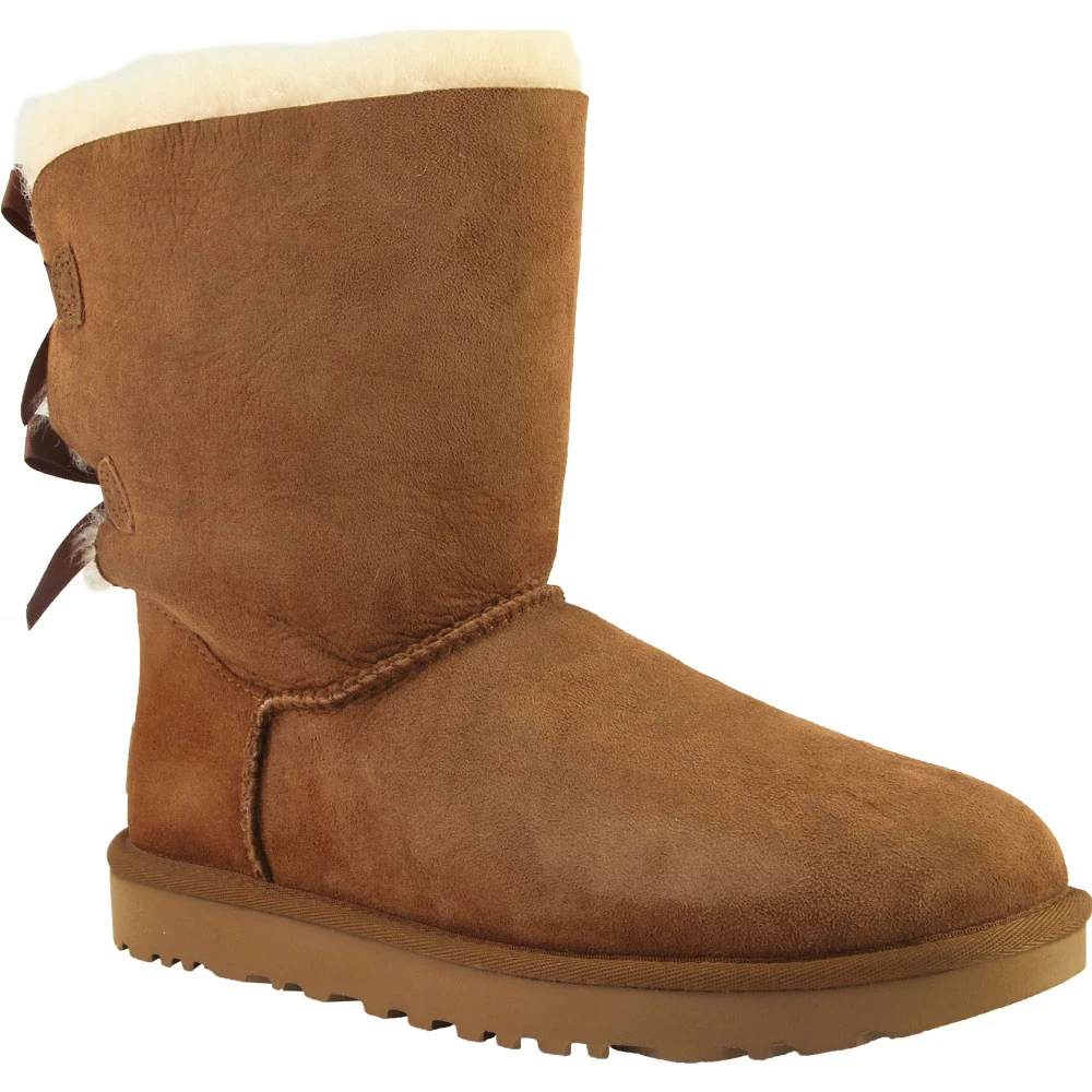 UGG® Bailey Bow 2 Women’s Comfort Boots. Slip into the iconic look and cozy feel of the UGG® Bailey Bow 2. The sheepskin uppers work to repel moisture and protect against stains. New Treadlite by UGG outsole provides increased traction, durability and cushioning as you trudge through the snow. Two satin bows at the back of this boot give it a feminine twist and take a classic look into a fun fashion statement. Match your favorite cold-weather outfit to the UGG® Bailey Bow 2 and prove that cute can be cozy! Rogan’s Shoes is an authorized online retailer of UGG® boots and shoes. See link for details http://www.ugg.com/onlineretailers